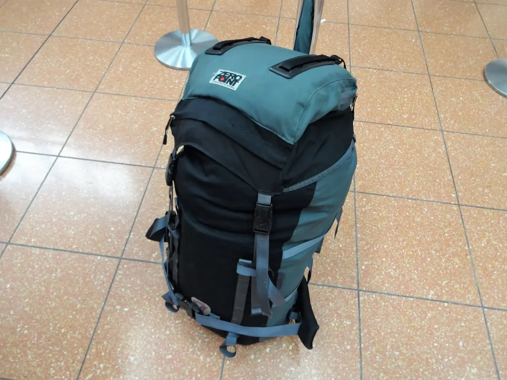 このザックのなかに、ピッケル2本、トレッキングポール、登山靴、ヘルメットを押し込んであります。重量は15kgでした。