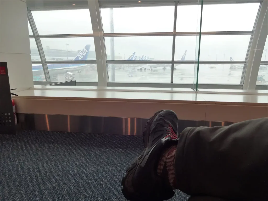 搭乗ゲート近くのラウンジで待機。外は小雨です。