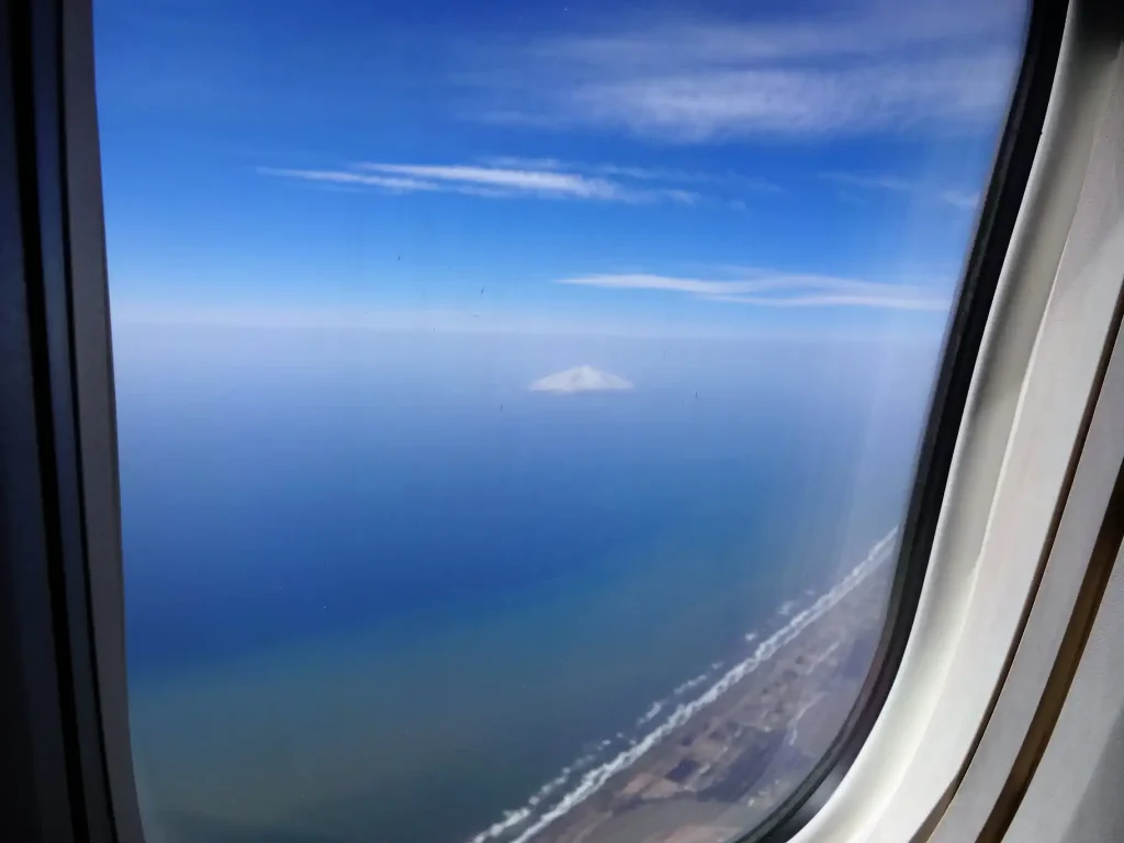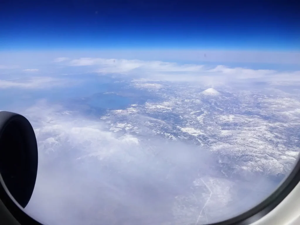 北海道上空。おぉっ、あの特徴的な湖とミニ富士山は?