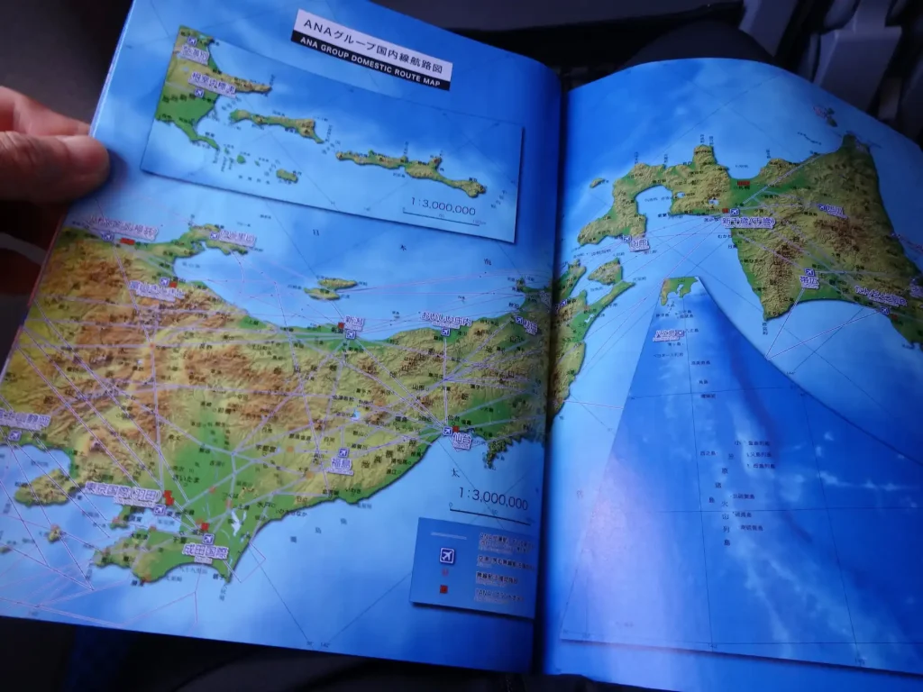座席のポケットに入っている「翼の王国」という冊子の後ろ側に日本地図が掲載されています。