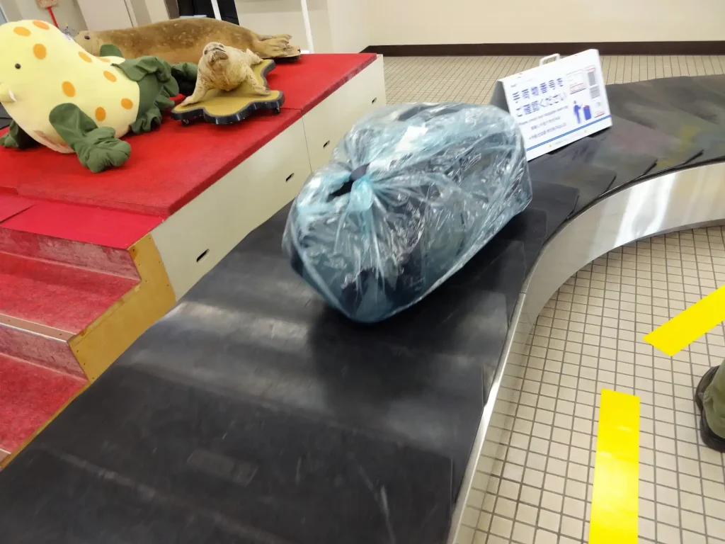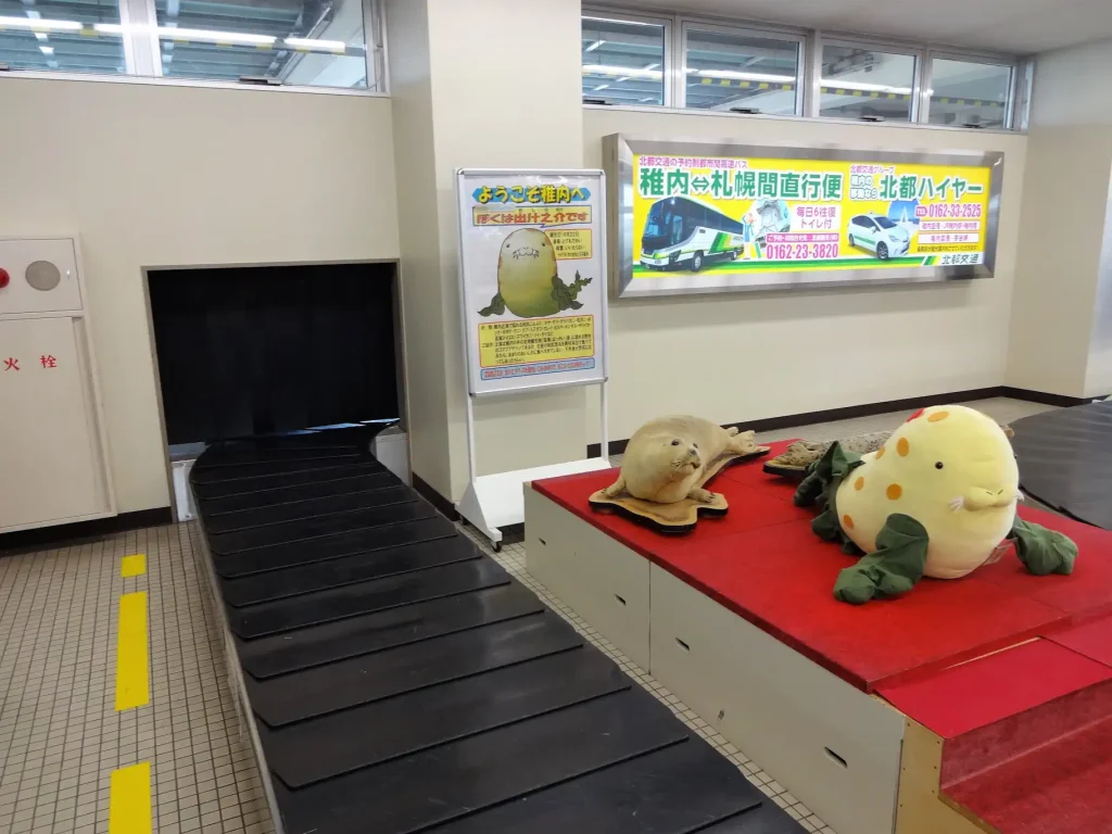 稚内空港に到着。ゆるキャラ「出汁之介」(だしのすけ)の前で預け荷物を待ちます。