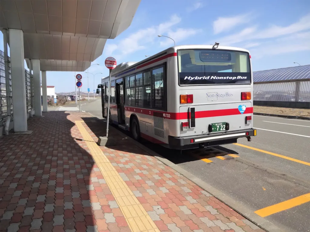 空港の玄関を出て、すぐ左側に稚内フェリーターミナル行きのバスが待ち構えています。このバスへの乗り換え時間は10分程度しかありませんでした。が、飛行機の到着に合わせて発車するので、飛行機が延着しても大丈夫らしいです。空港の係員さんがトコトコ駆けてきて、もうバス利用者がいないことを、バスの運転手さんに告げました。
