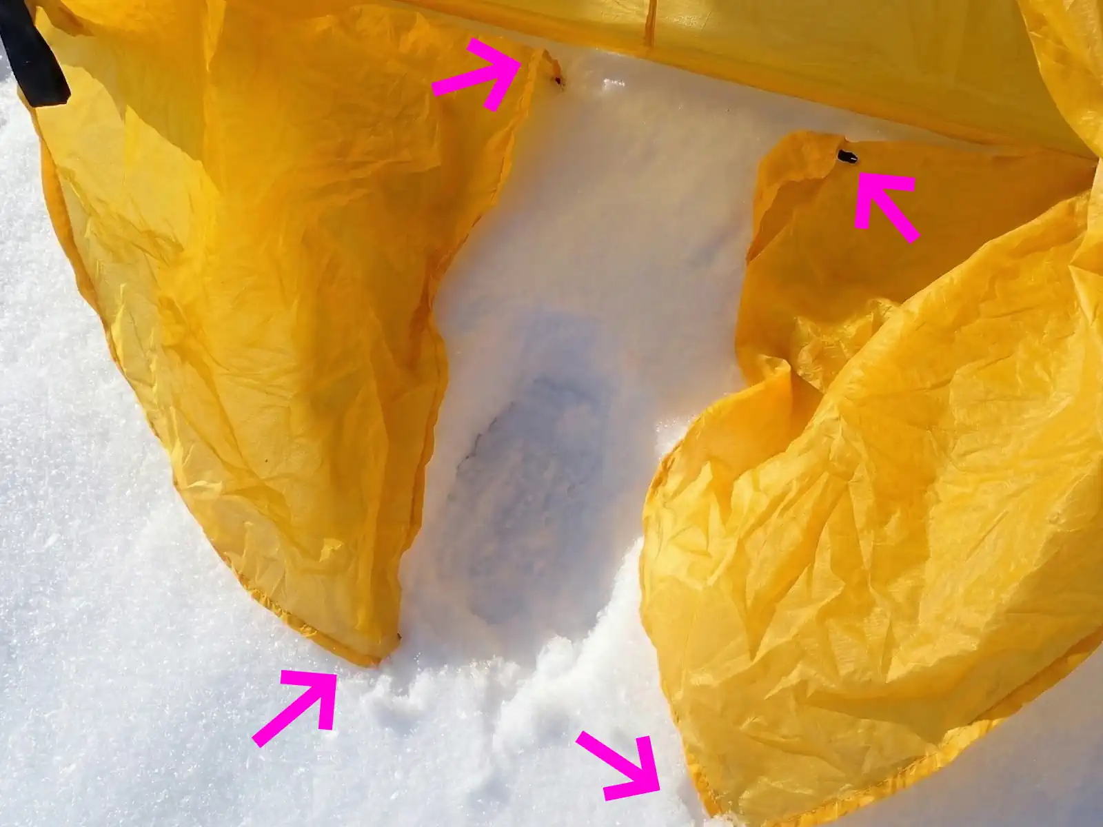 潜り込んでみました。出入口のファスナーの類はないので、後側のペグを抜いて、裾をめくりました。