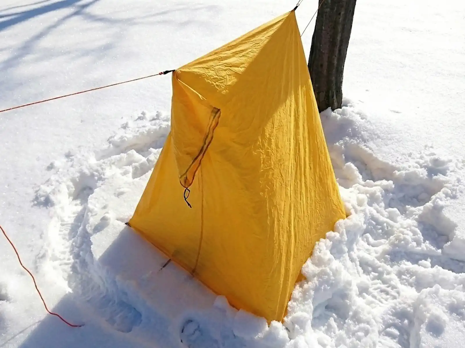 家型に設営してみました。樹の間に細引きで吊り下げて、四隅をペグダウンしただけです。