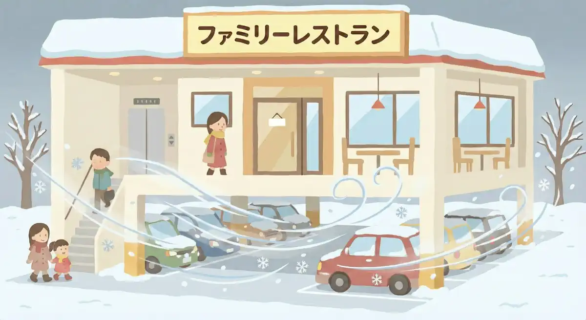 このファミレスは2階にあります。1階は吹き抜けの駐車場になっており、暖房がやや追いつかない感じです。