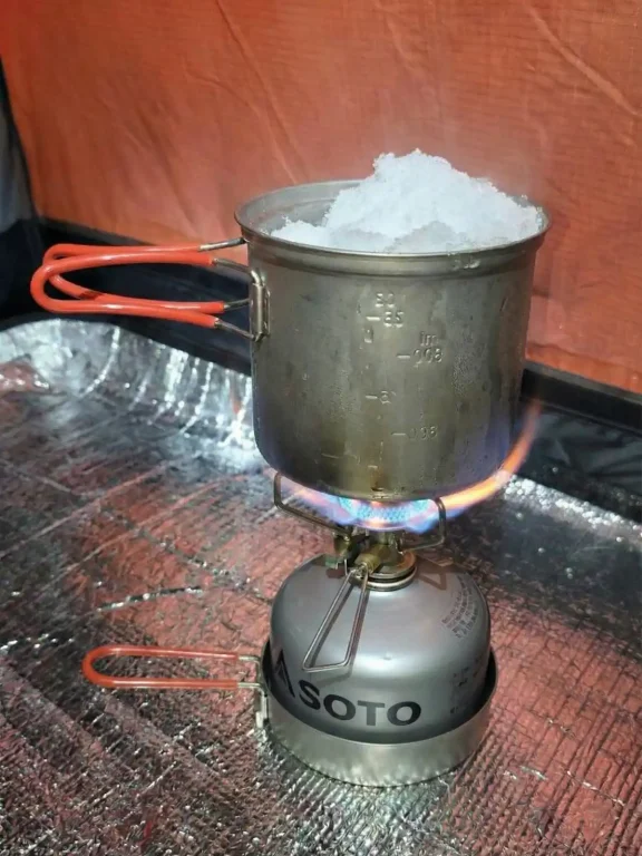 個人的に「ぬるま湯ブースター」と呼んでいる裏技があります。雪を溶かして水を作るときなど、ガスカートリッジがキンキンに冷えて火が衰えたら、ぬるま湯をはったクッカーで温めます。