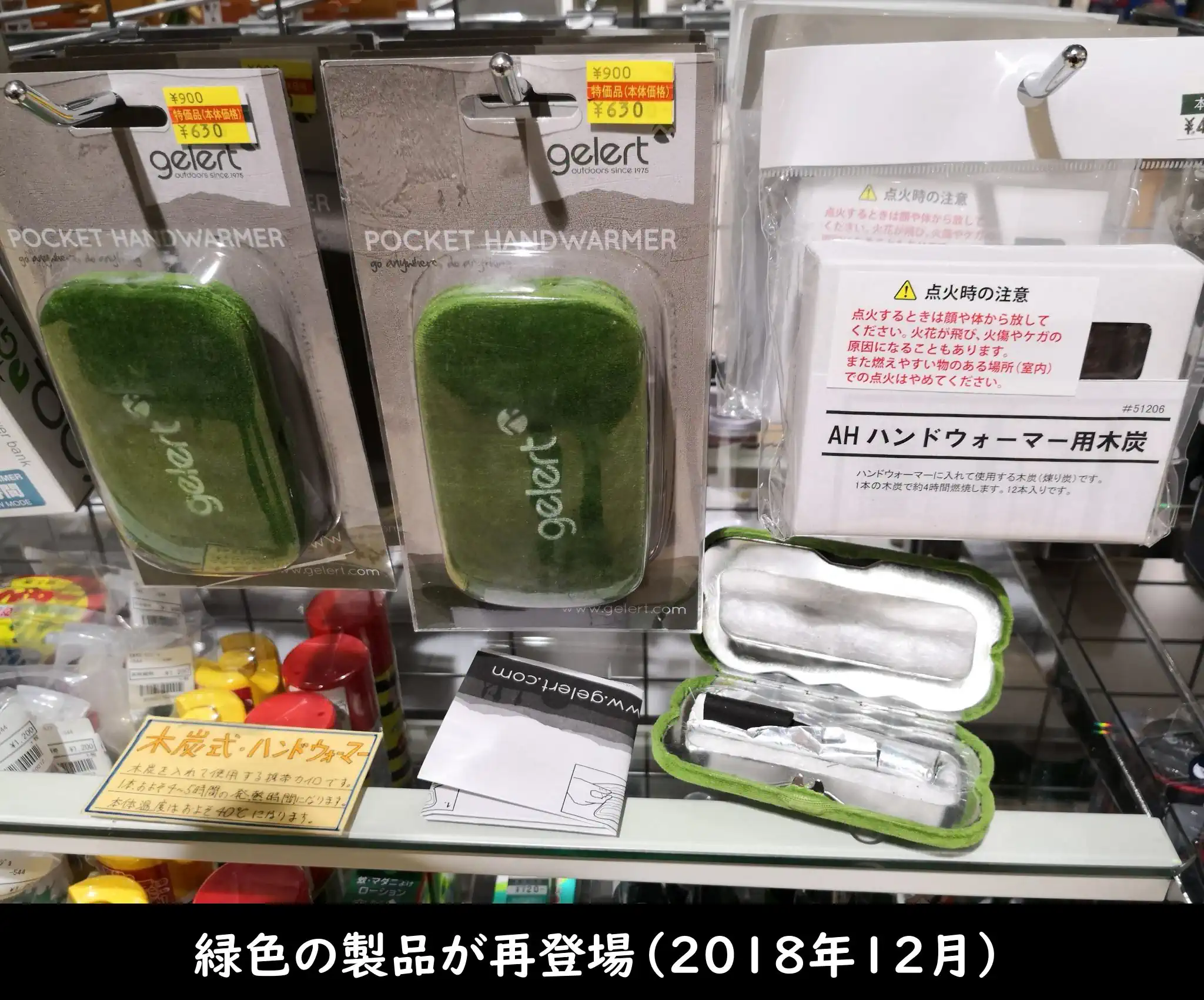 2018年12月、好日山荘の立川店で緑色の製品を見かけました。デッドストックでしょうか。展示品の木炭はなぜか銀紙でおおわれています。
