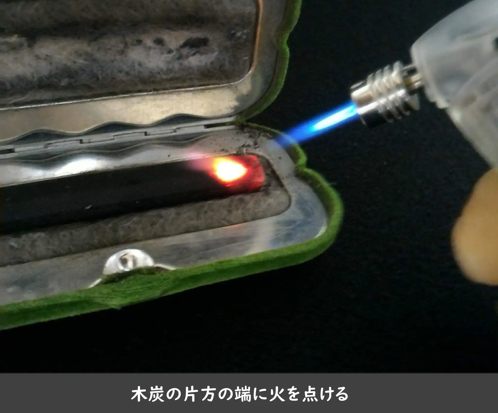 木炭の片方の端に火を点ける