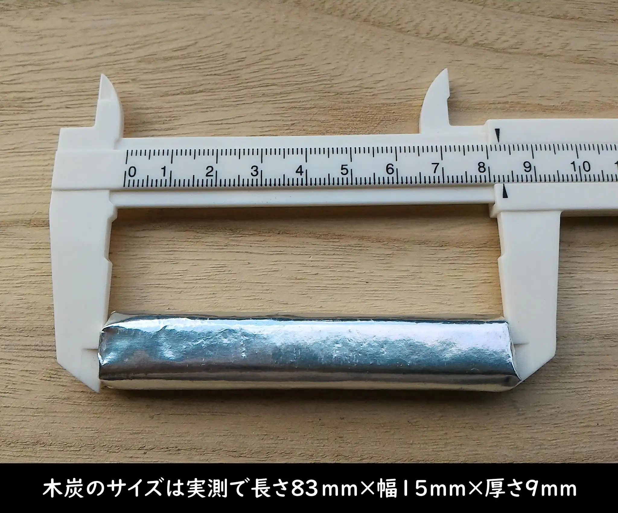 燃料スティック1本(銀紙付き)のサイズは実測で長さ83mm×幅15mm×厚さ9mmでした。