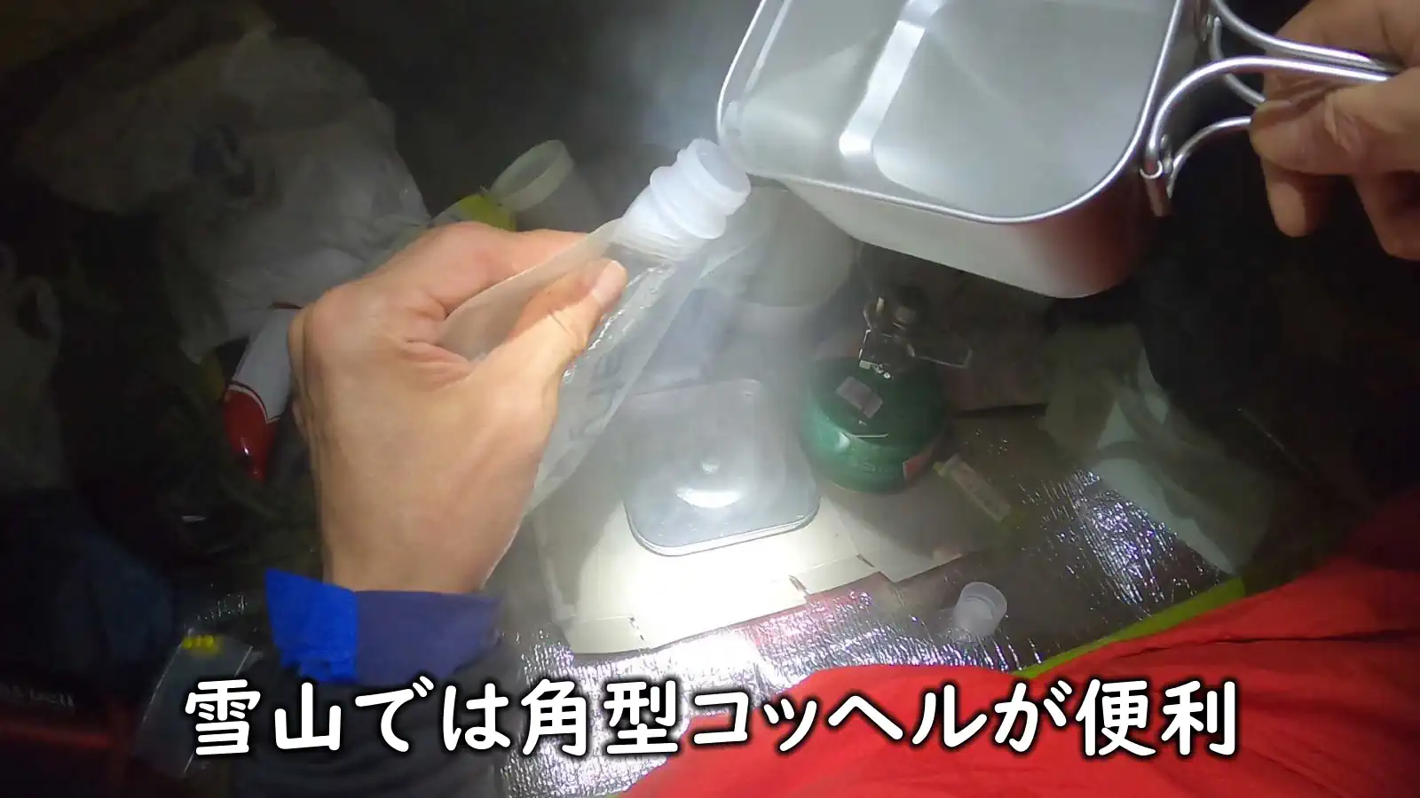 この作業には角型コッヘルが便利です。広口で雪のかたまりを投入しやすく、プラティパスの狭い口に注ぎやすい。