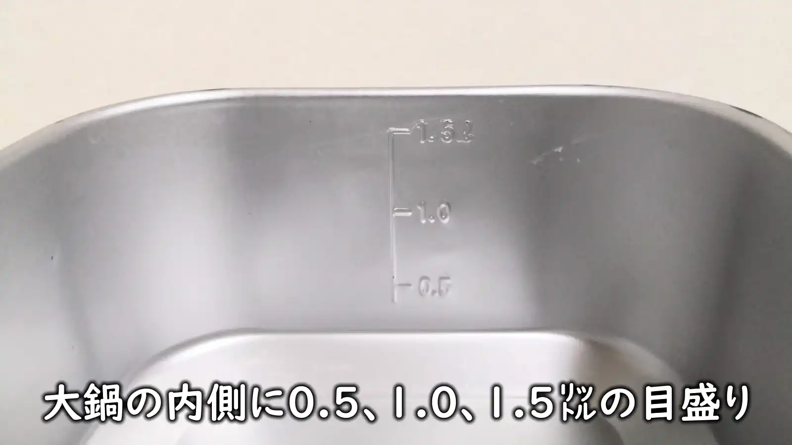 大きいほうのクッカーの内側に0.5、1.0、1.5リットルの目盛りが刻まれています。