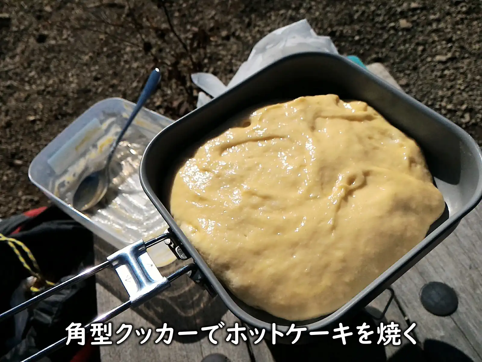 まぁ、「丸いクッカーでも口が広ければ投入しやすいだろう」と言われればそうなんですが、角型クッカーが真価を発揮するのは沸かしたお湯をプラティパスにうつす場面です。