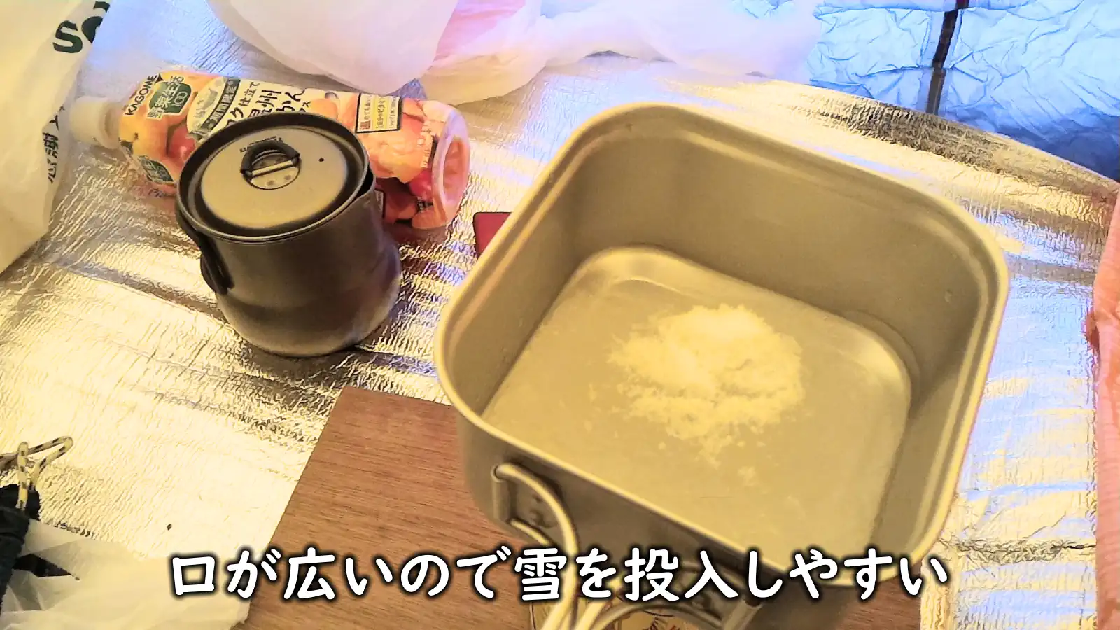 私はポリ袋に雪を集めておき、マグカップですくって、角型クッカーに投入します。ジェットボイル等、ガスカートリッジをピッタリ収納することを想定したクッカーだと、口が狭くて投入しにくいです。