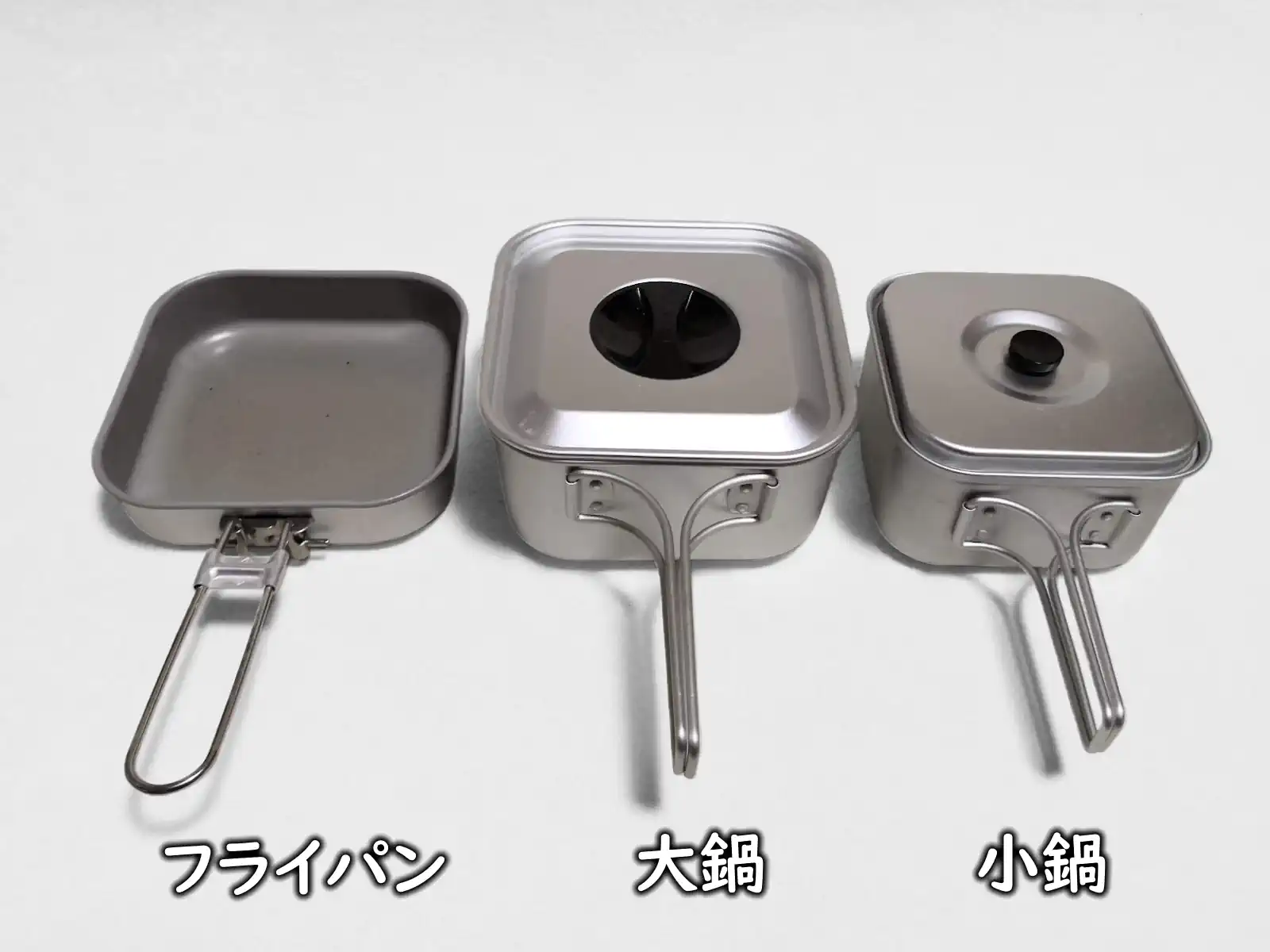 実測重量は、フライパンが134g、大クッカーが237g、小クッカーが156gです。