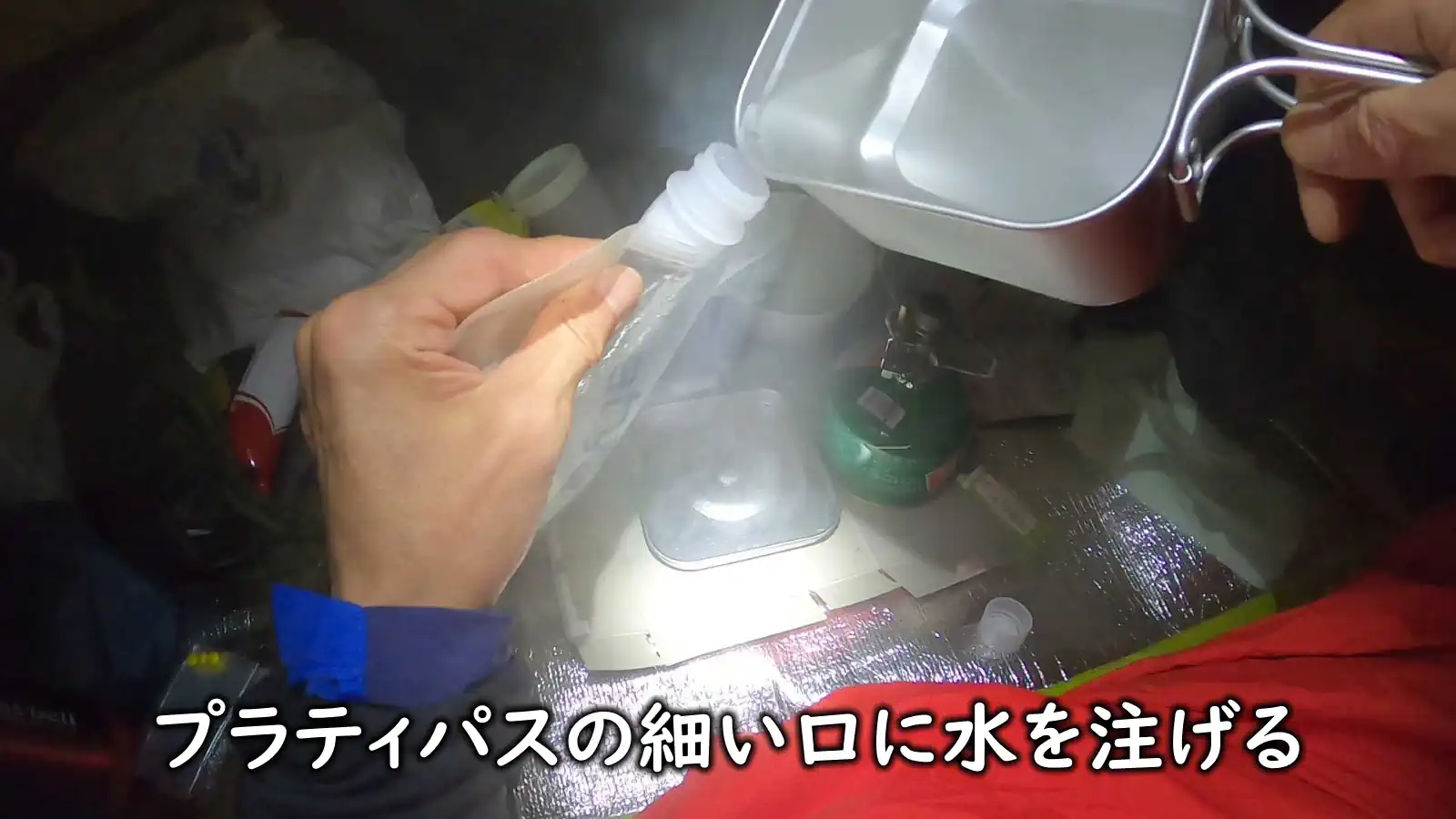 私は雪山でよくプラティパスにお湯を入れて「湯タンポ」にします。注ぎ口を切っていない丸いクッカーだと、こんな風にプラティパスの細い口に注ぐ芸当はできません。
