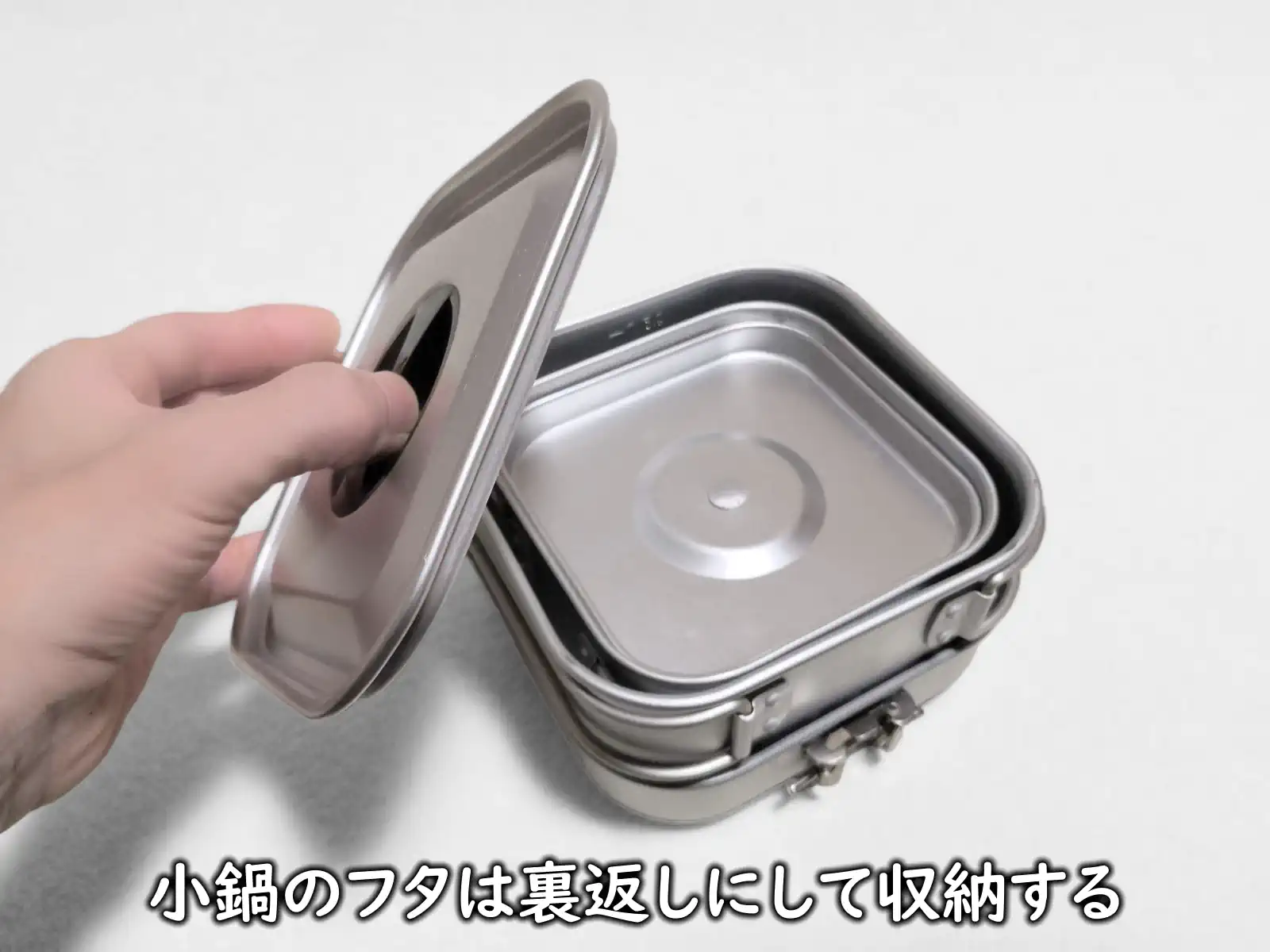 小さいほうのクッカーのフタは裏返しになっています。こうしないと大きいほうのフタが閉まりません。