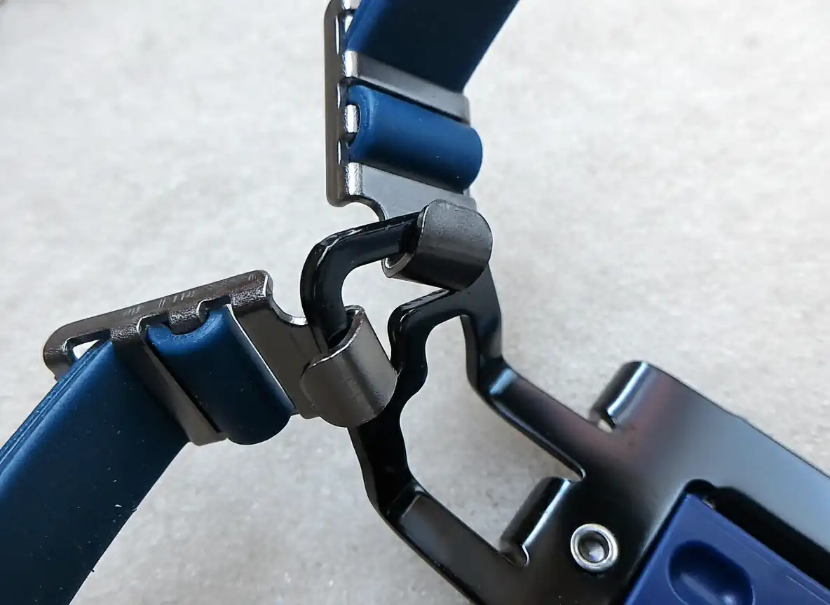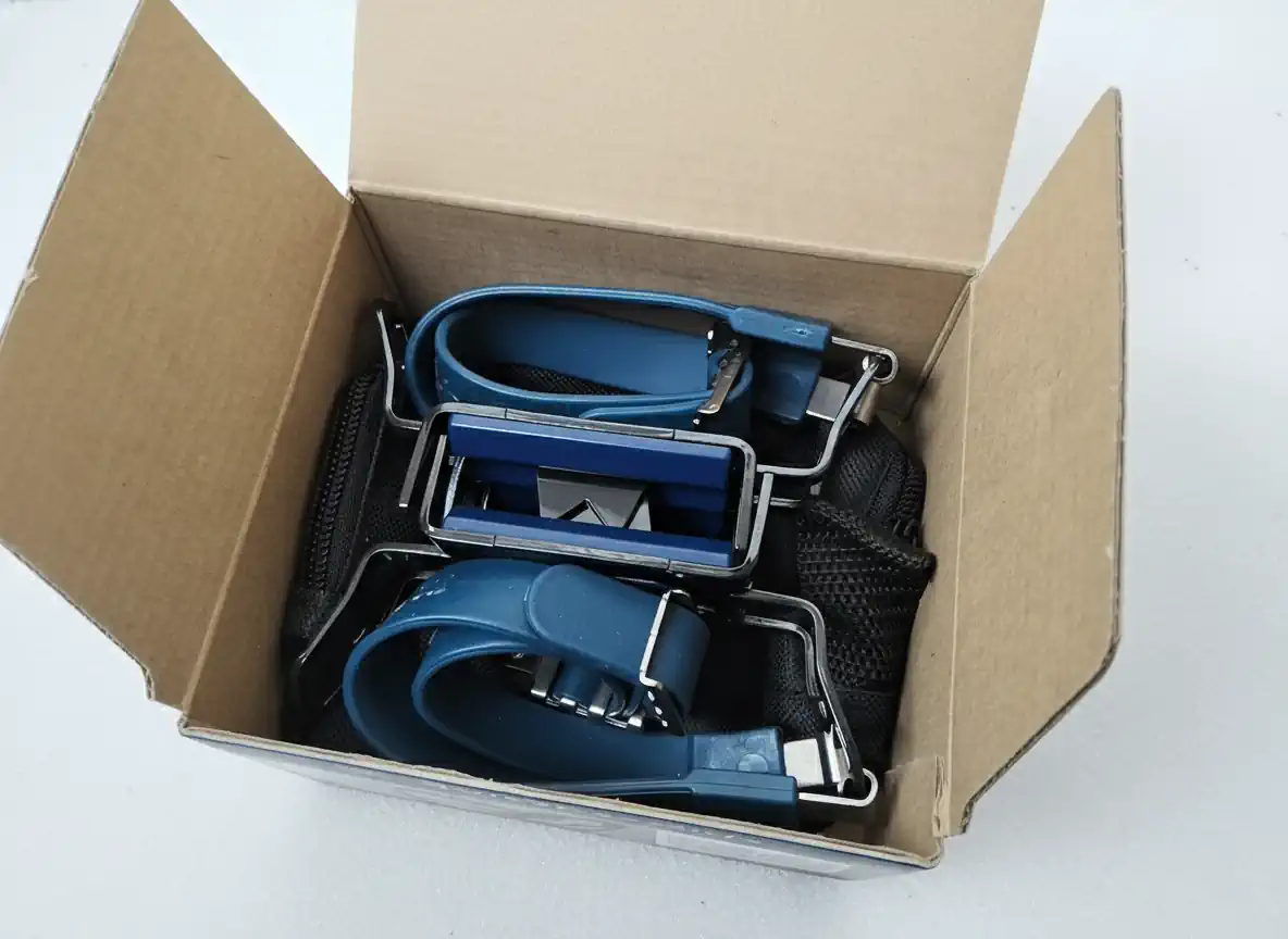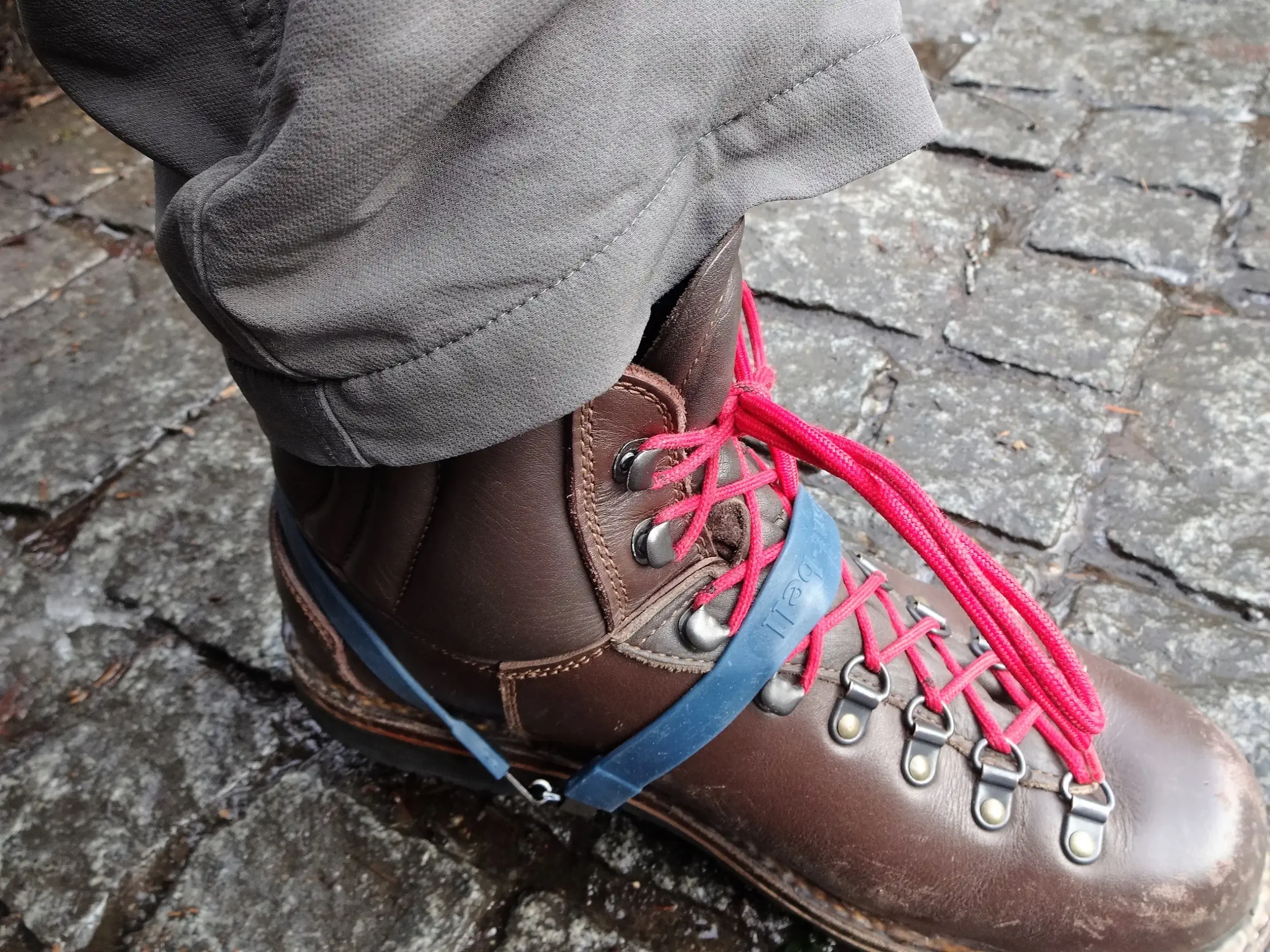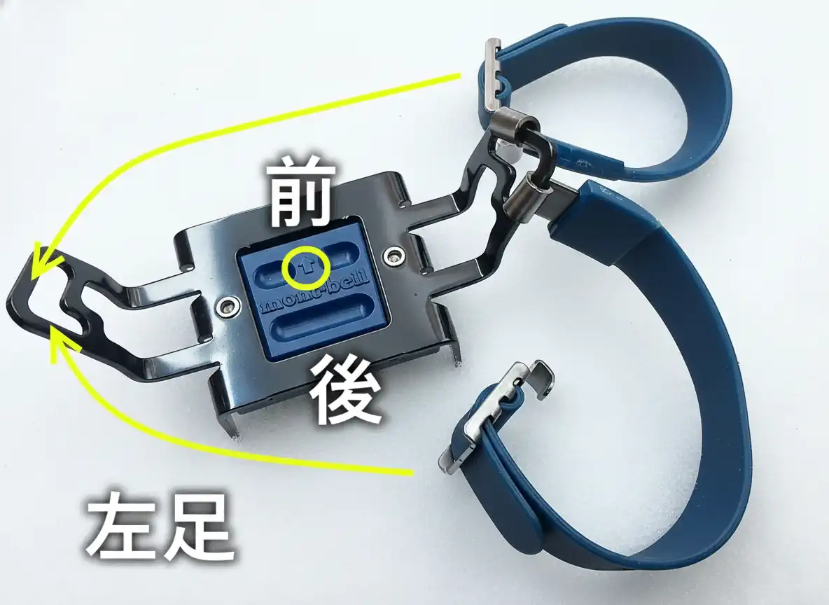 本体の構造、バンドを留める位置ともに左右対称になっています。2本のゴムバンドを甲の上側、踵の後側に回して、反対側にフックで留めます。フックを着脱する側を足の外側にします。