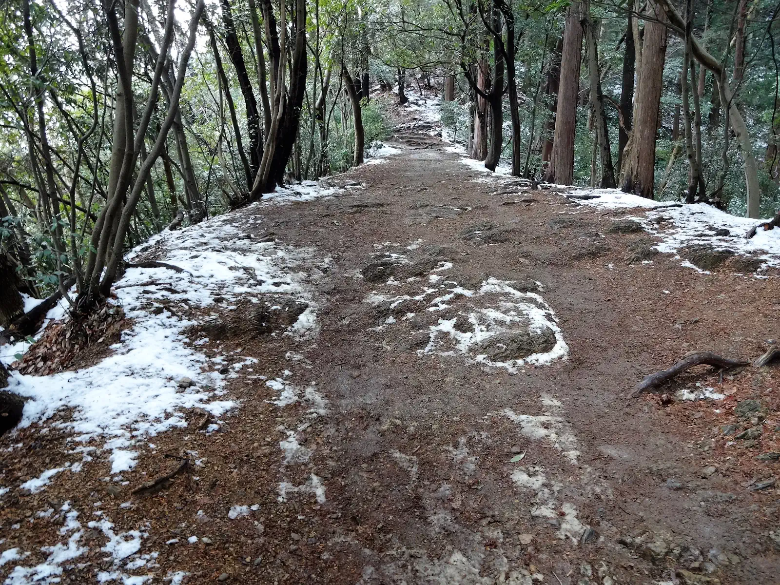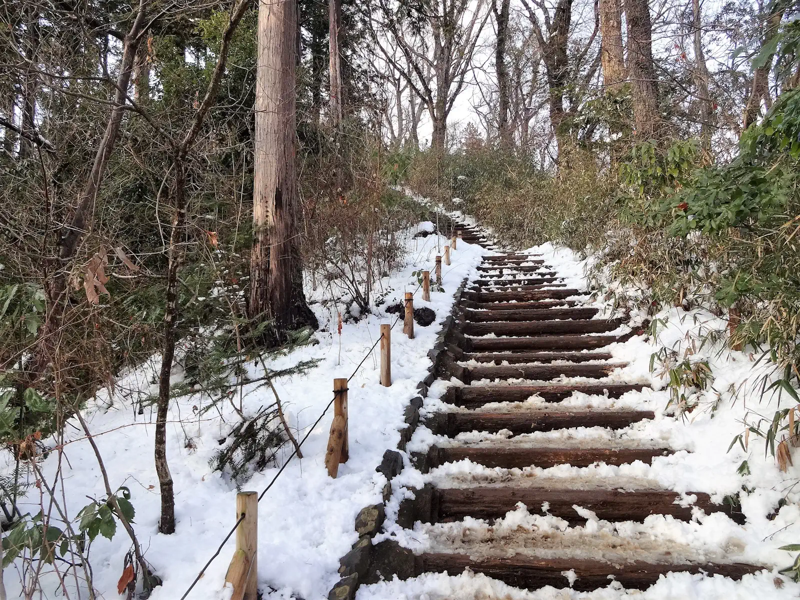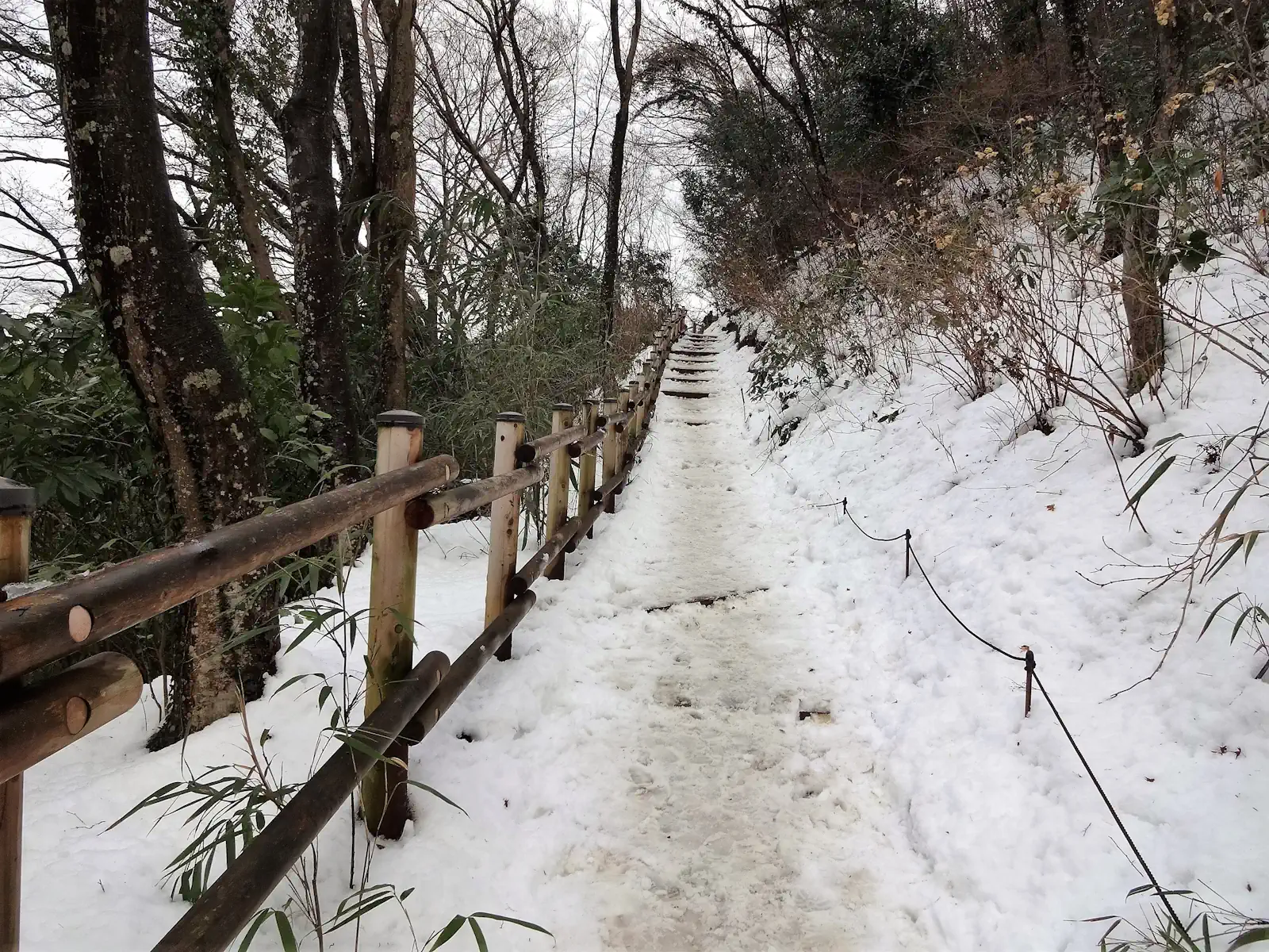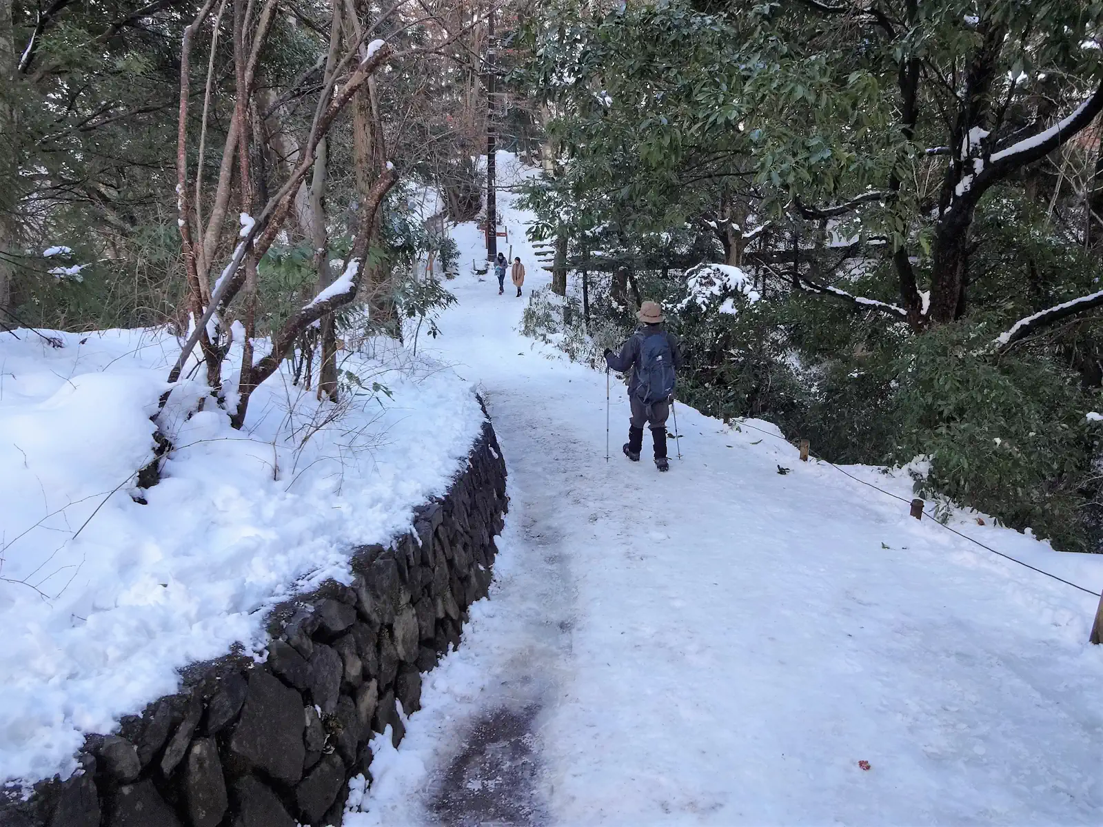 私が中腰のまま滑落した(が、転倒はしなかった)のは、この石垣沿いです。そのときは石垣の上には雪がありませんでした。一昨日の雪でこれだけ積もったのですね。道の右側のほうが靴がもぐるので歩きやすそうですが、女性がそちら側にうずくまっていたので、左側を歩きました。そしたら……です。観光地化された登山道で安全地帯に見えますが、滑落の速度が増して、稜線の左右に落ちたら、急傾斜の樹林帯をボブスレーすることになりかねません。