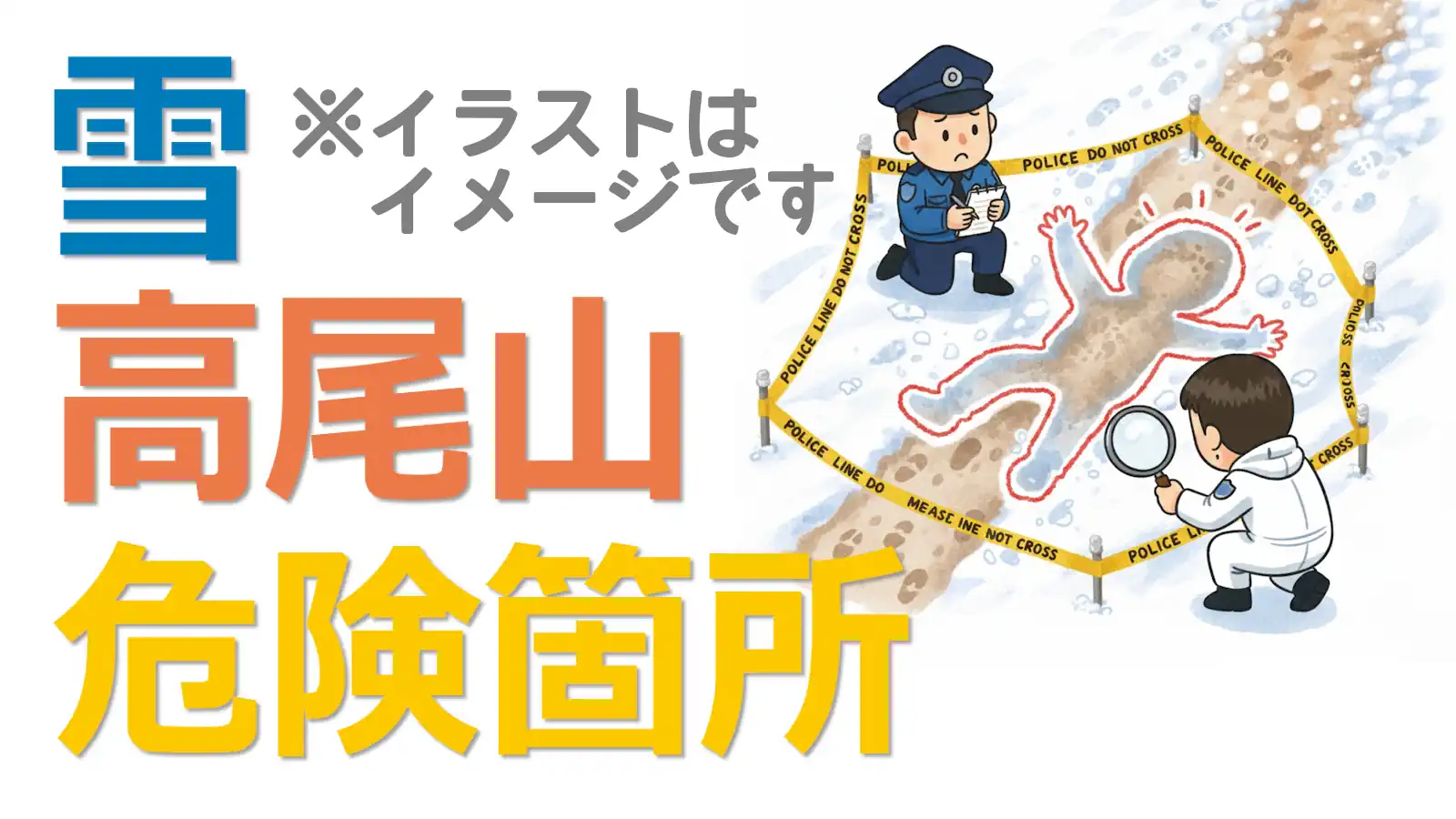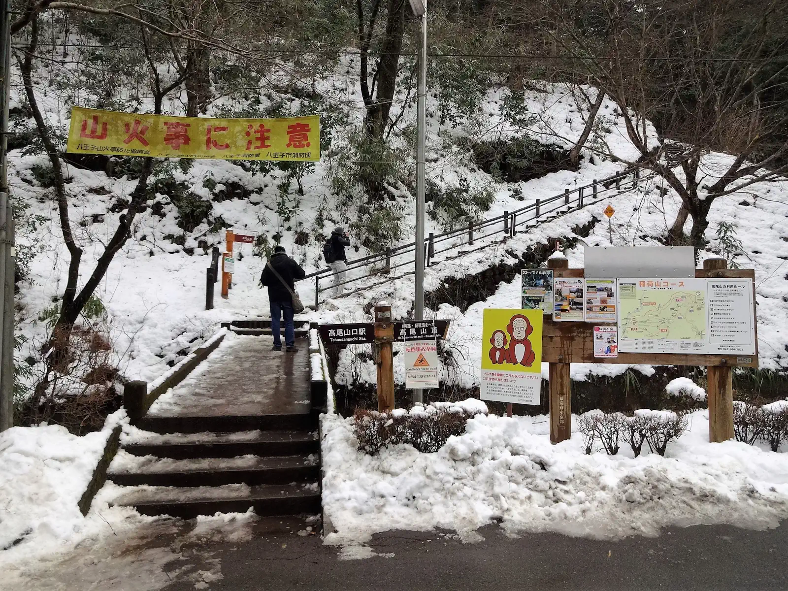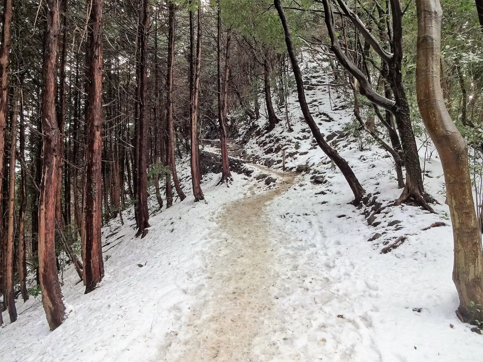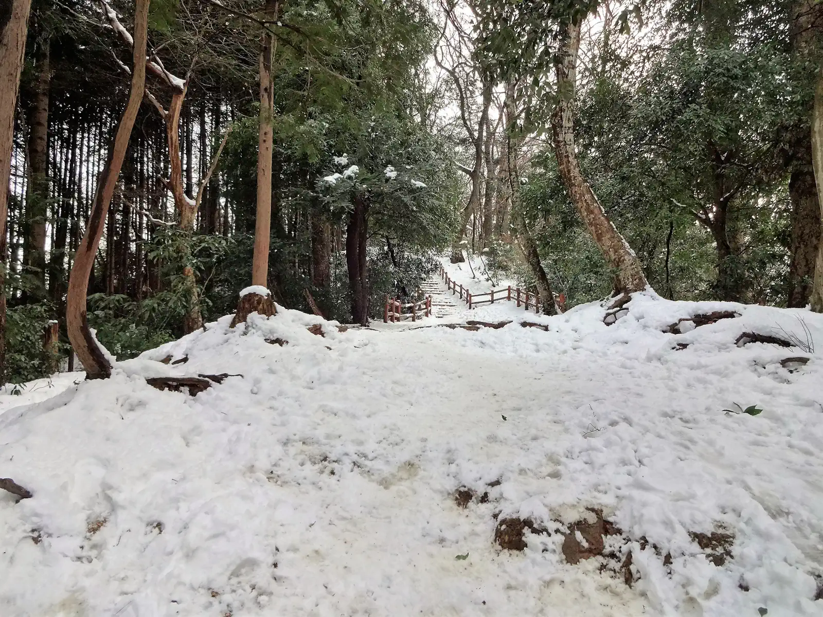 私が中腰のまま滑落した(が、転倒はしなかった)のは、この石垣沿いです。そのときは石垣の上には雪がありませんでした。一昨日の雪でこれだけ積もったのですね。道の右側のほうが靴がもぐるので歩きやすそうですが、女性がそちら側にうずくまっていたので、左側を歩きました。そしたら……です。観光地化された登山道で安全地帯に見えますが、滑落の速度が増して、稜線の左右に落ちたら、急傾斜の樹林帯をボブスレーすることになりかねません。