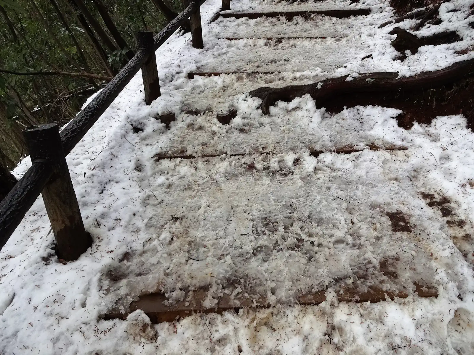 6号路との合流点近くまでやってきました。階段の段差を埋めて斜めに積もった雪が厄介です。傾斜はそれほどありませんが、登山者が同じ場所を踏むので、ツルツルになりがちです。