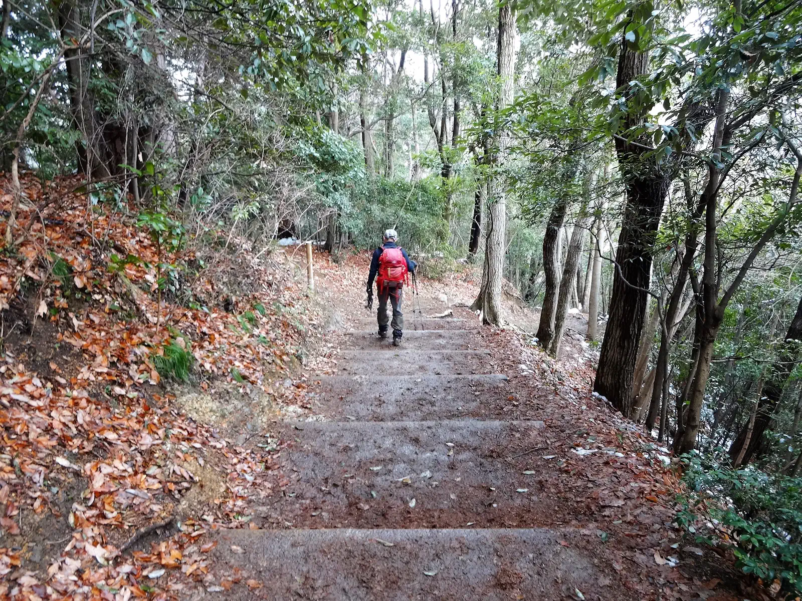 ここは見た目より傾斜が急です。昔はもっと段差が大きい階段があり、膝の負担が大きかったと記憶しています。現在はステップを緩く傾斜させて、段差を小さく、段数を少なく整備されています。階段というよりは、ところどころに低い段差がある坂になっています。