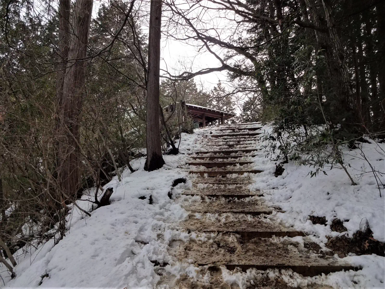 奥の院不動堂の横で「コンパクトスノースパイク」を外しました。