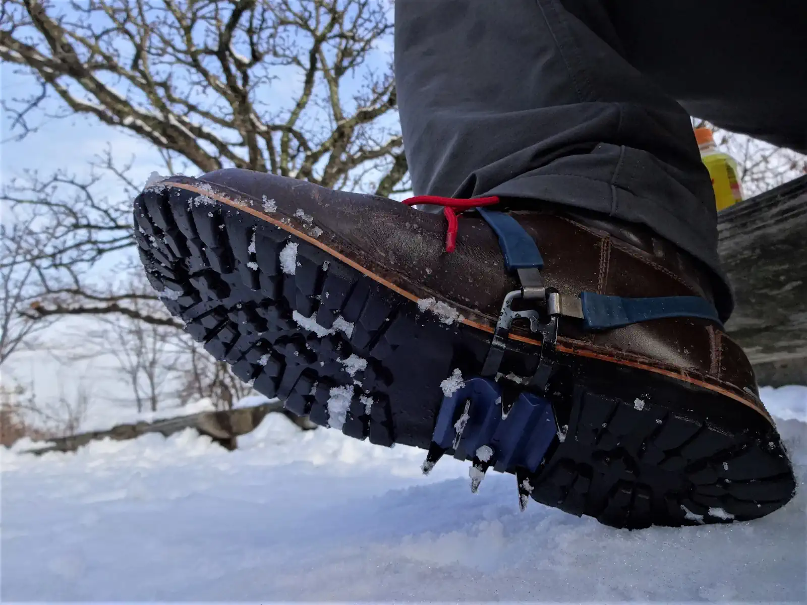 爪先寄りにスパイクがないので、ぐずぐすの雪面で推進力を助ける効果は薄いです。アイスバーンで転倒しないための道具と割り切る必要があります。街中向きかな。