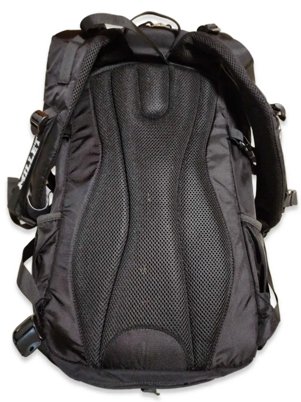 「クーラ30(KULA 30)」の背面パネルは、通気性の高いメッシュのクッションになっています。ショルダーハーネスの内側も同じ素材です。身体への当たりが柔らかく、汗を速やかに拡散してくれます。いいことずくめのようですが、実はデメリットもありまして……(後述)。
