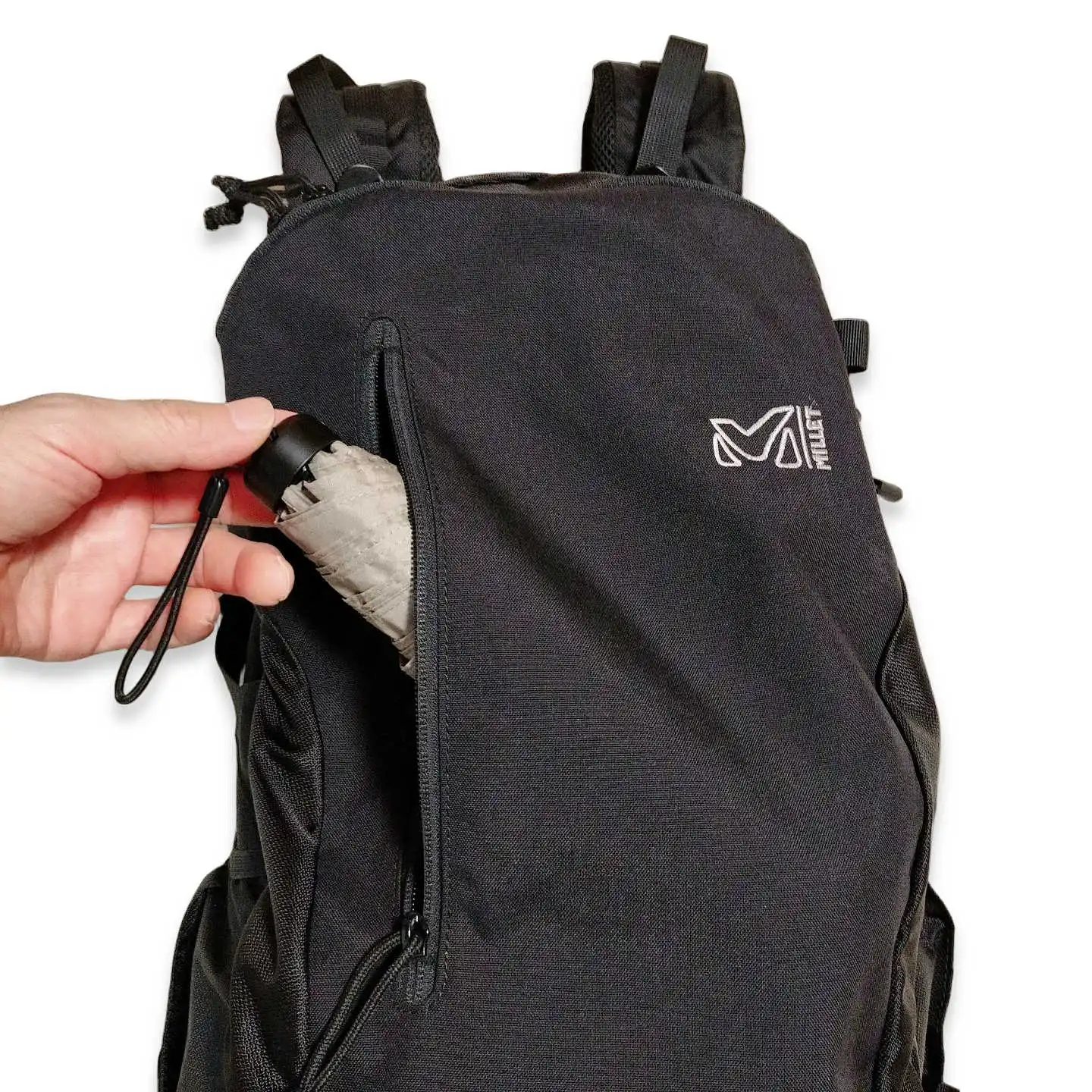 折り畳み傘をサイドポケットに挿す人が多いですが、筆者はバックパックの外側にモノをぶら下げたり、露出させたりするのを好みません。