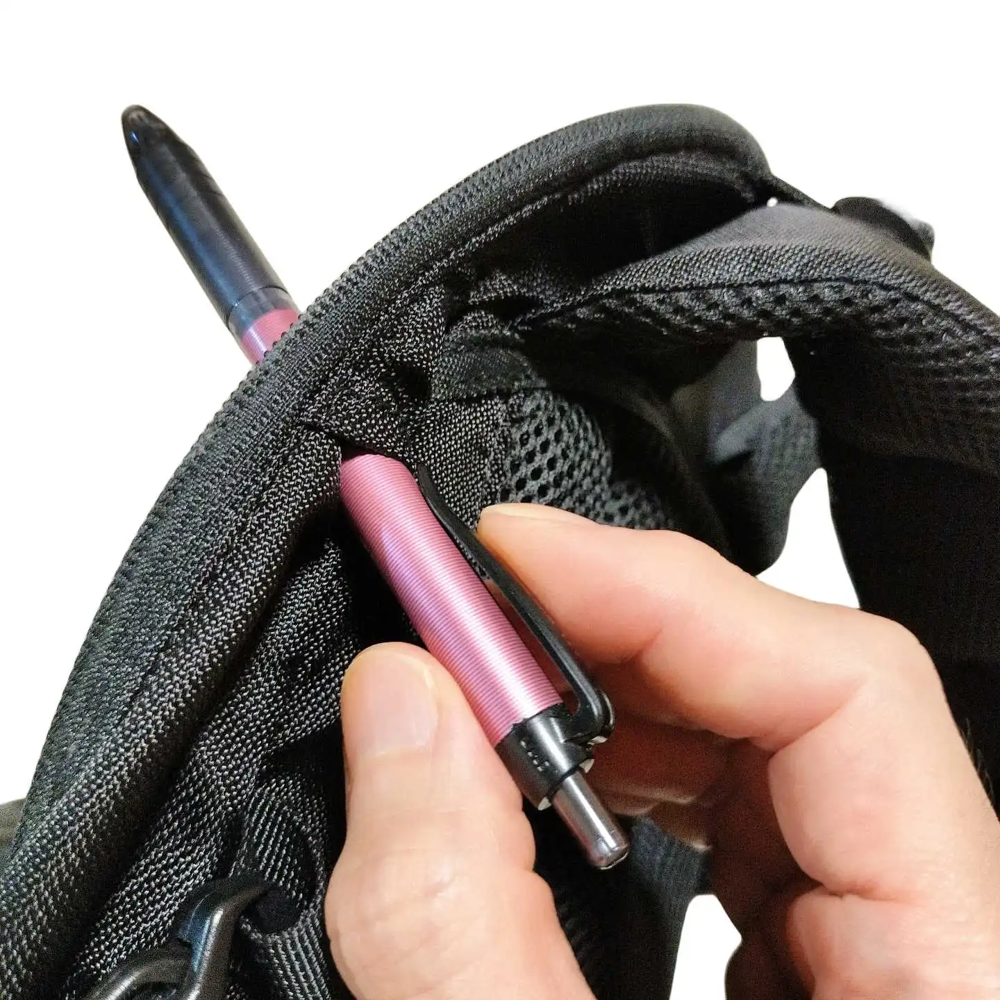 サイズ感がわかりやすいように、カロリーメイト(高さ10×幅10.6×厚さ2cm)や山と高原地図(高さ19×幅10.5×厚さ0.75cm)を収納してみました。ペンホルダーが2つあります。