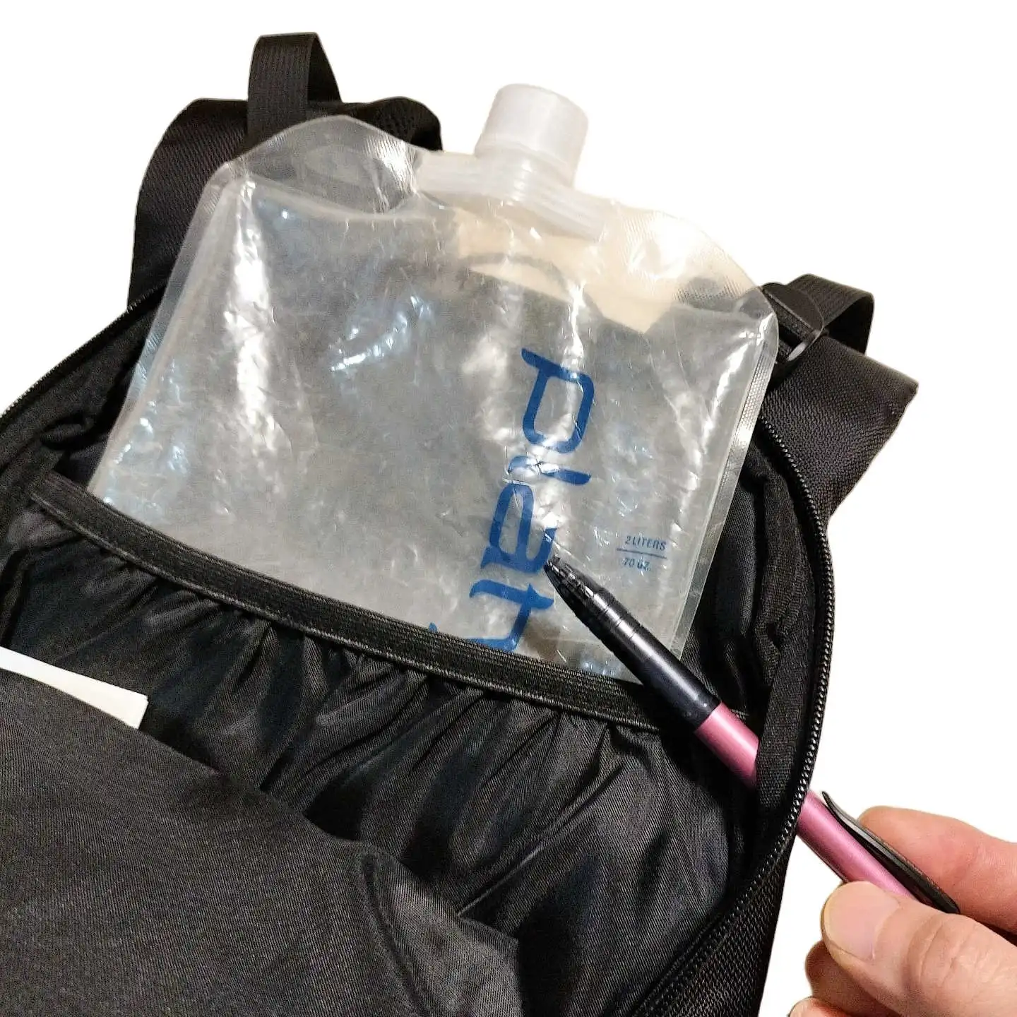 公式サイトの「クーラ30(KULA 30)」紹介ページではフューチャーされていませんが、メイン収納部の背中側スリーブにプラティパス等ソフトボトルを入れて、ハイドレーションポケットとして利用できます。