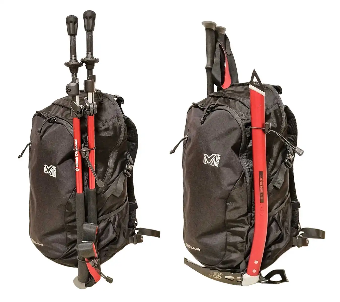 折りたたんだトレッキングポールやピッケルを括り付けることができます。