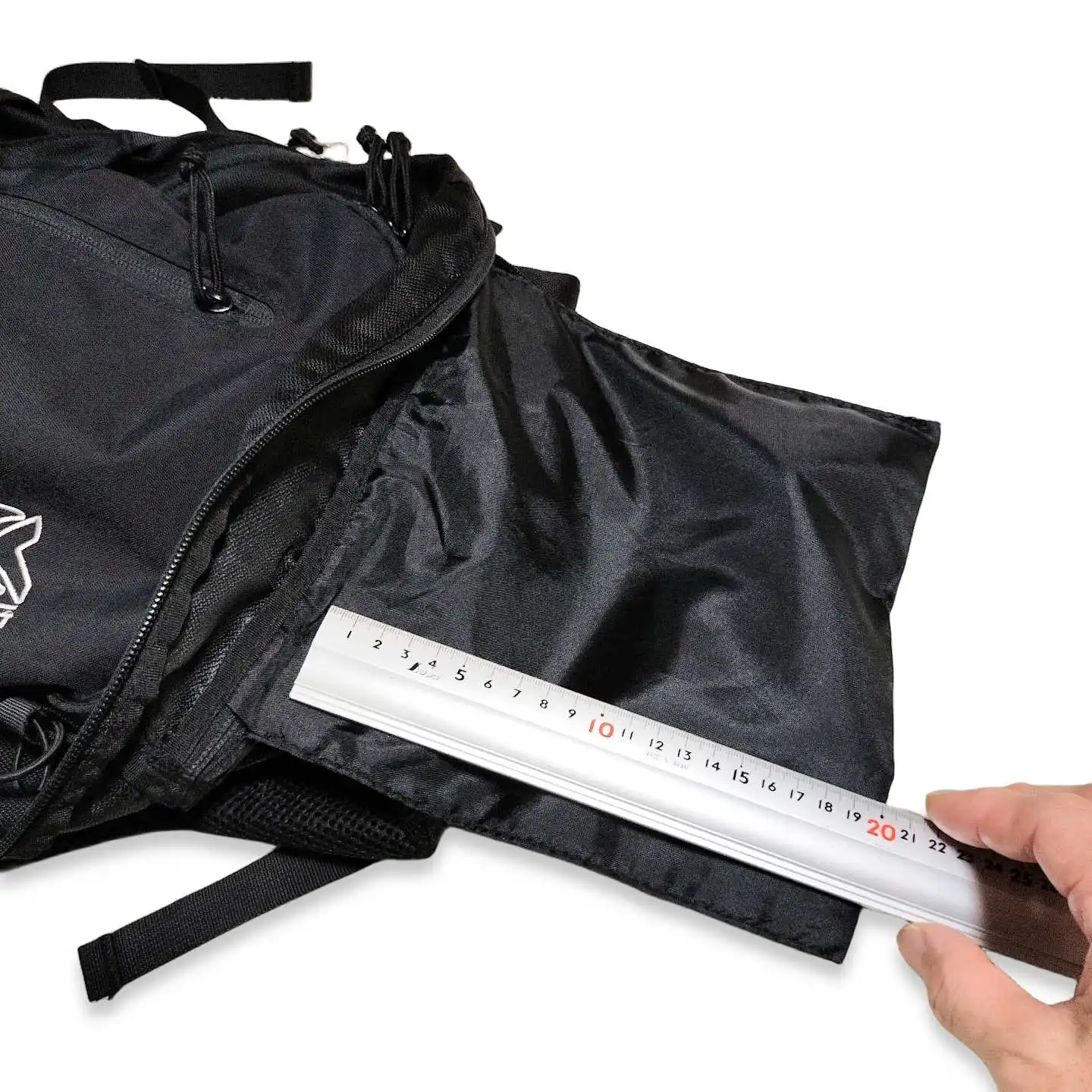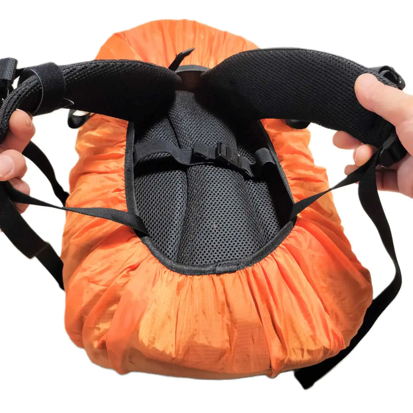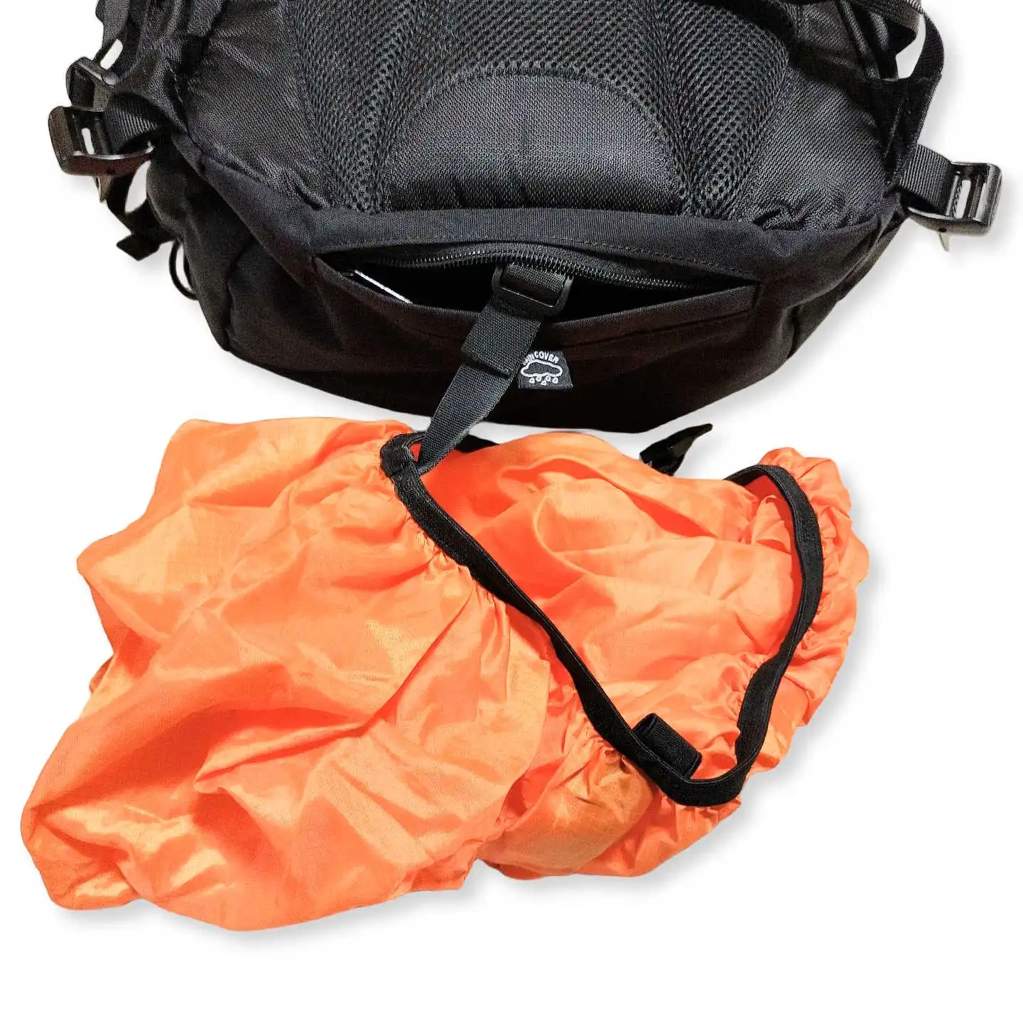 「クーラ30(KULA 30)」底部にはレインカバーが収納されています。ファスナーを開いて引き出すと、そのままスッポリとバックパック全体に被せることができます。