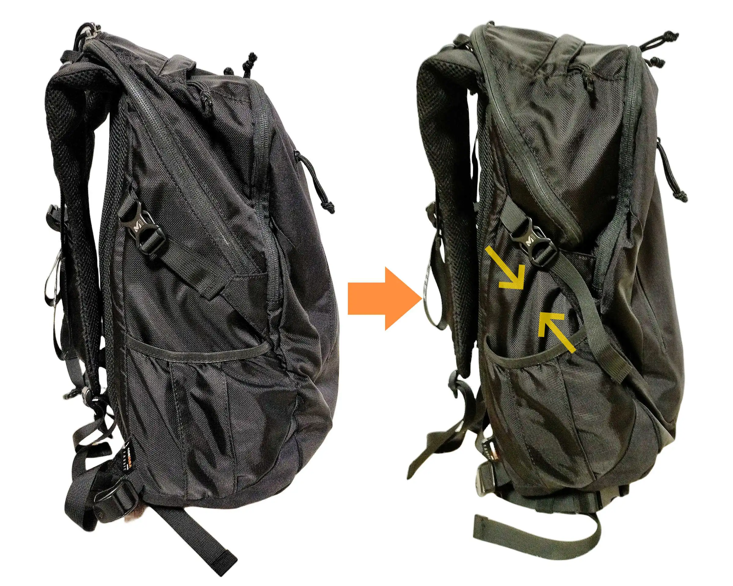 特に、荷物が少ないとき、モノが下部に集まって膨らむと、見た目がだらしなく、重心が振られやすくなります。サイドコンプレッションストラップを締めると、パックの厚みを抑えて、重心を背中に近づけることができます。