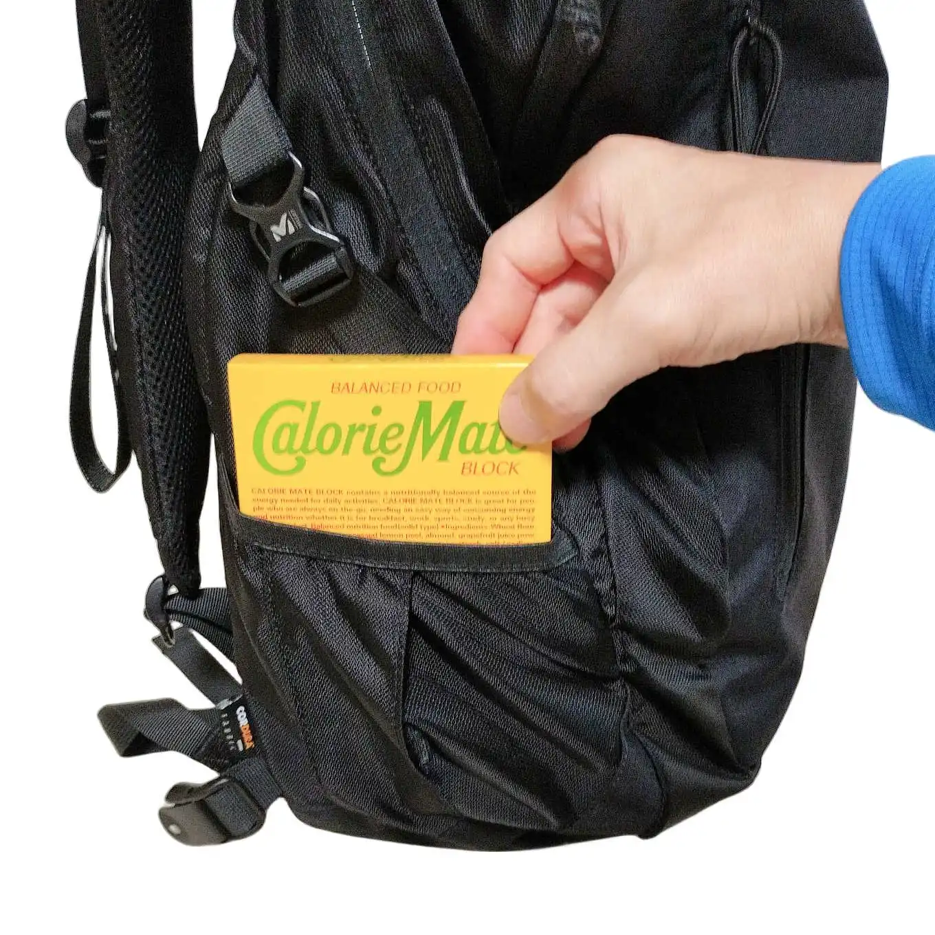 マチ付きでカロリーメイト(高さ10×幅10.6×厚さ2cm)がスッポリ入ります。ただし、メイン収納部にパンパンに荷物を詰めると、カロリーメイトは潰れそうです。