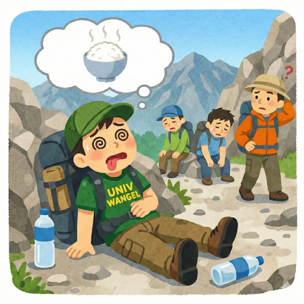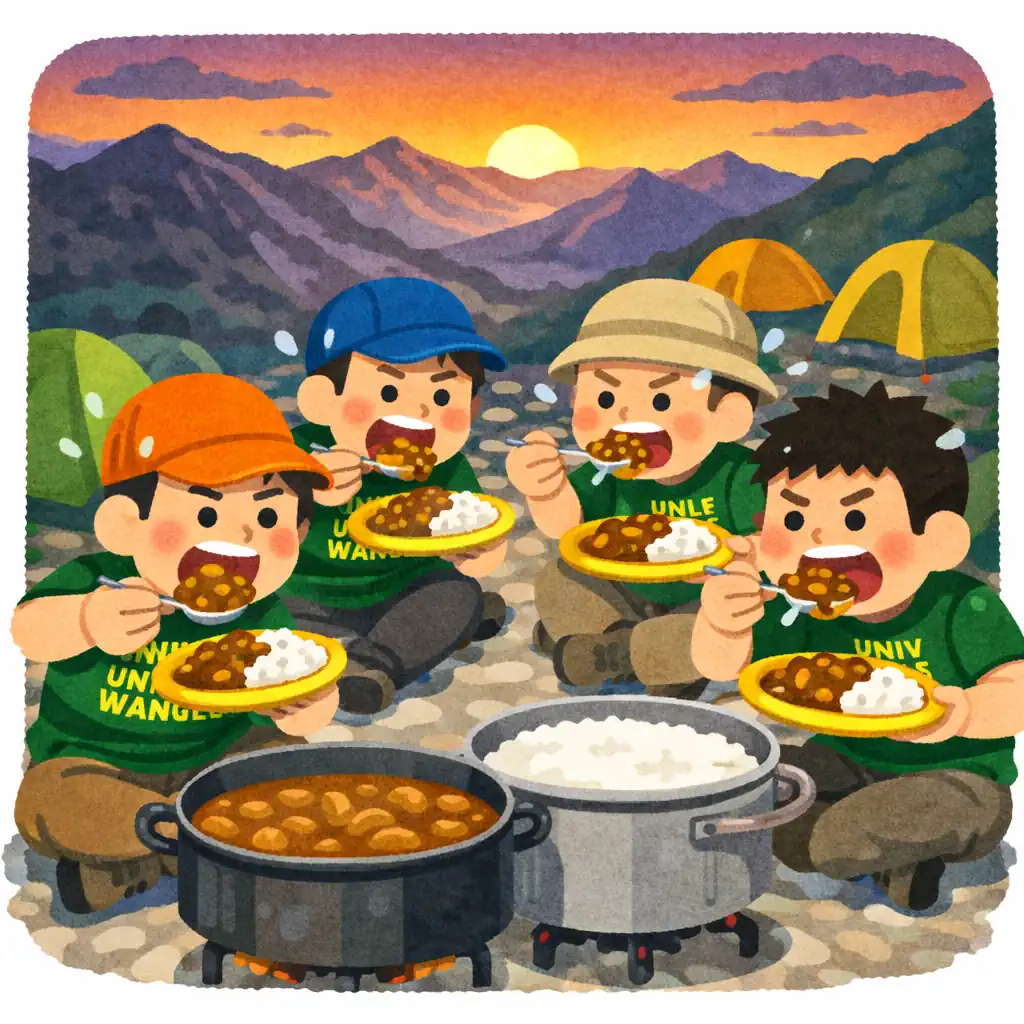 - 武器(ぶき): スプーンや箸を「武器」と呼びましょう。過酷なテント泊縦走において、大鍋で作られたカレーとご飯は、争奪戦の標的です。猫舌のメンバーは、熱々のルーに冷水をぶっかけてでもかき込み、他人の二杯目に間に合わせようとします。その手にあるのはスプーンではなく、まさに生きるための「武器」なのです。