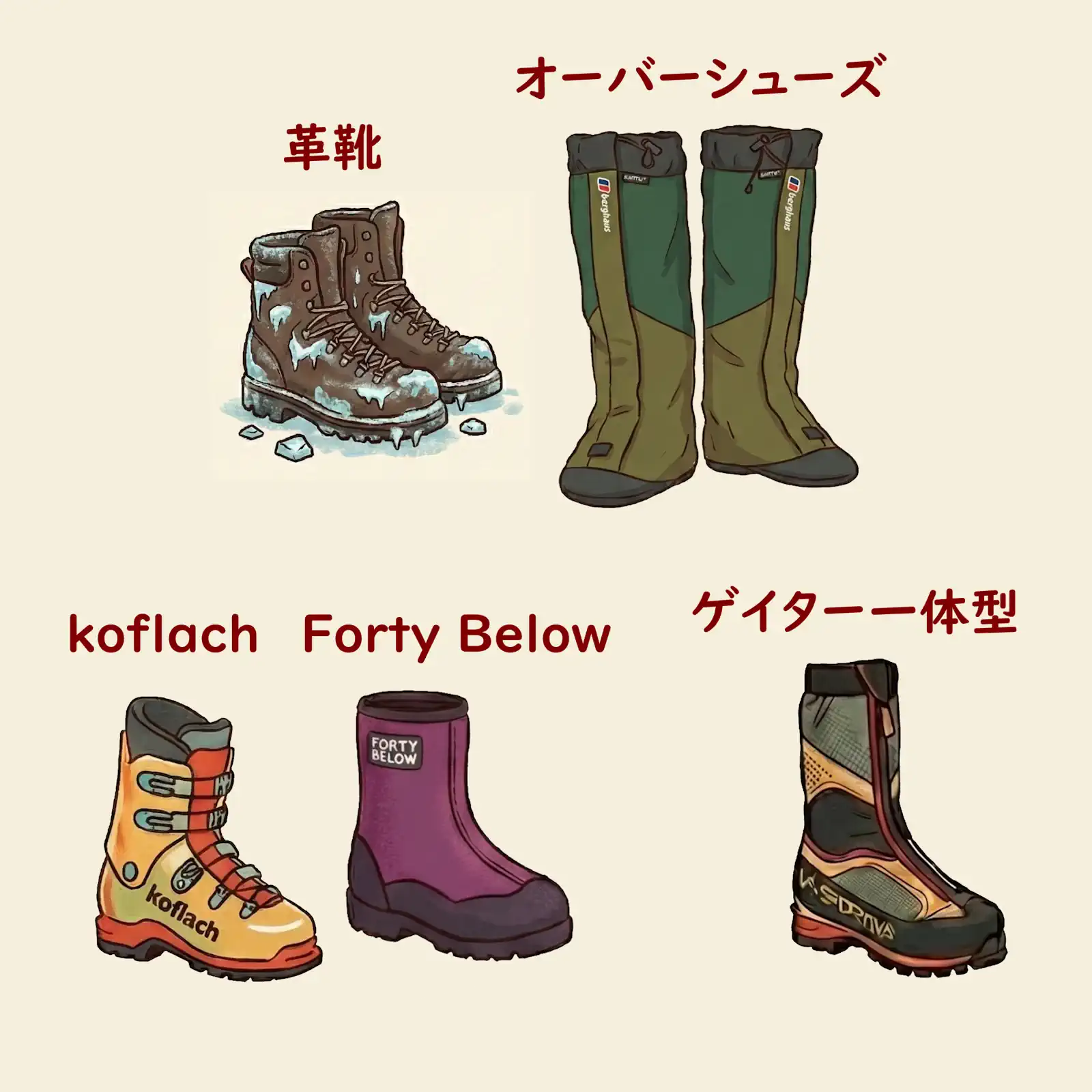 - 現在: 冬靴(保温・防水完璧) + ロングスパッツ(靴が強くなったので、オーバーシューズは不要になり、再びスパッツに戻った)