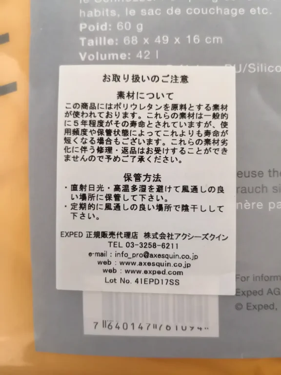 付属のポンプサックは注意書きにあるようにポリウレタンの劣化が進んでいたのかもしれません。なにしろポンプサックというやつは極薄のナイロン地、極薄のコーティング、極薄のシームシーリングとギリギリを攻めた設計となっています。