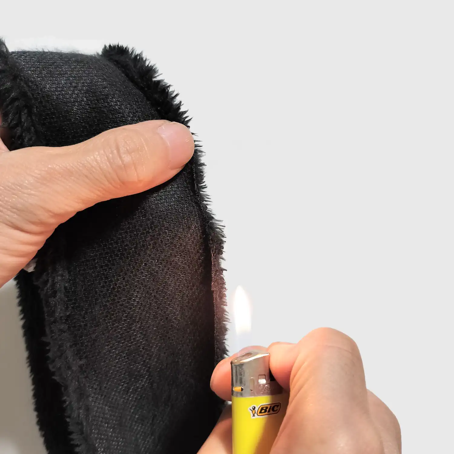 切り口から大量の毛が抜け落ちます。手でしごいて、あらかた落としきったら、切り口をライターの火で軽く炙り、それ以上ほつれないようにします。
