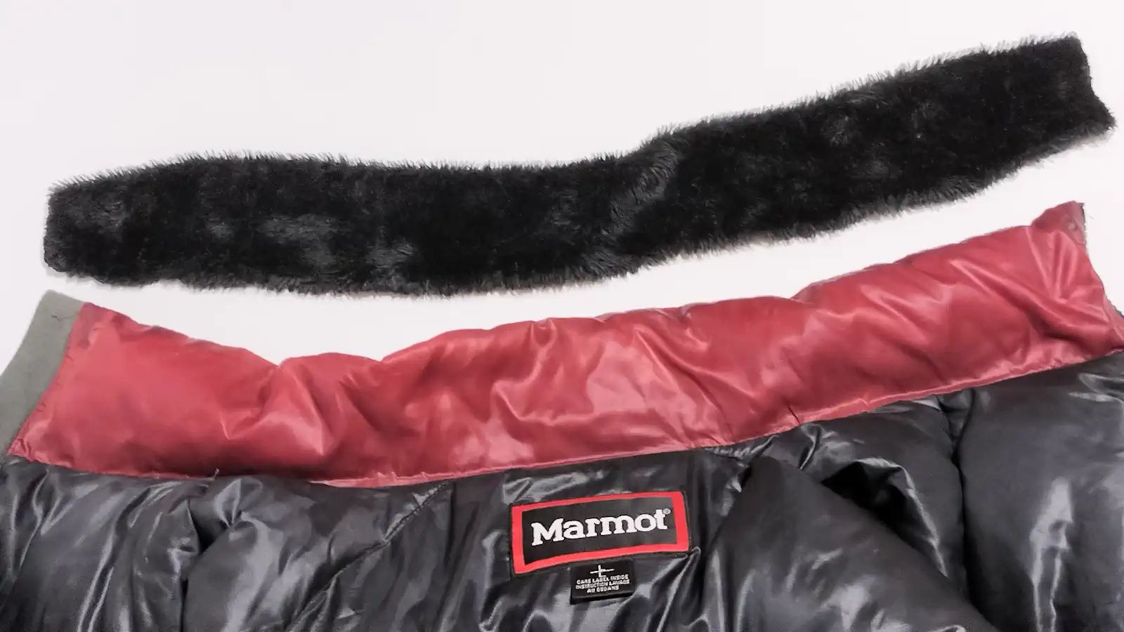 ダウンジャケットの襟に付けるには、半分以下の高さで十分です。つまり、このネックウォーマーひとつから4着分の材料を得ることができます。