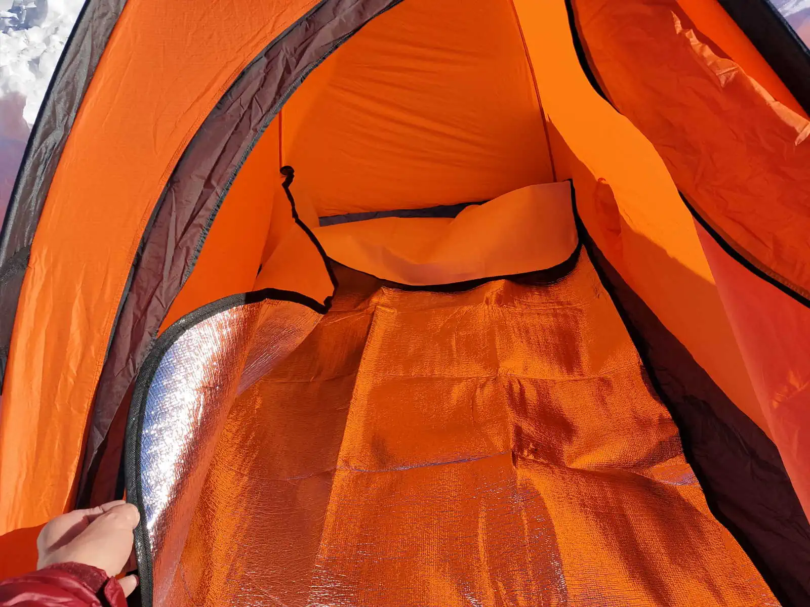 1人用のテントに敷く場合、余った部分を立てて、寝袋のサイドや足元に覆いかぶさるようにすると、寒気を和らげることができます。