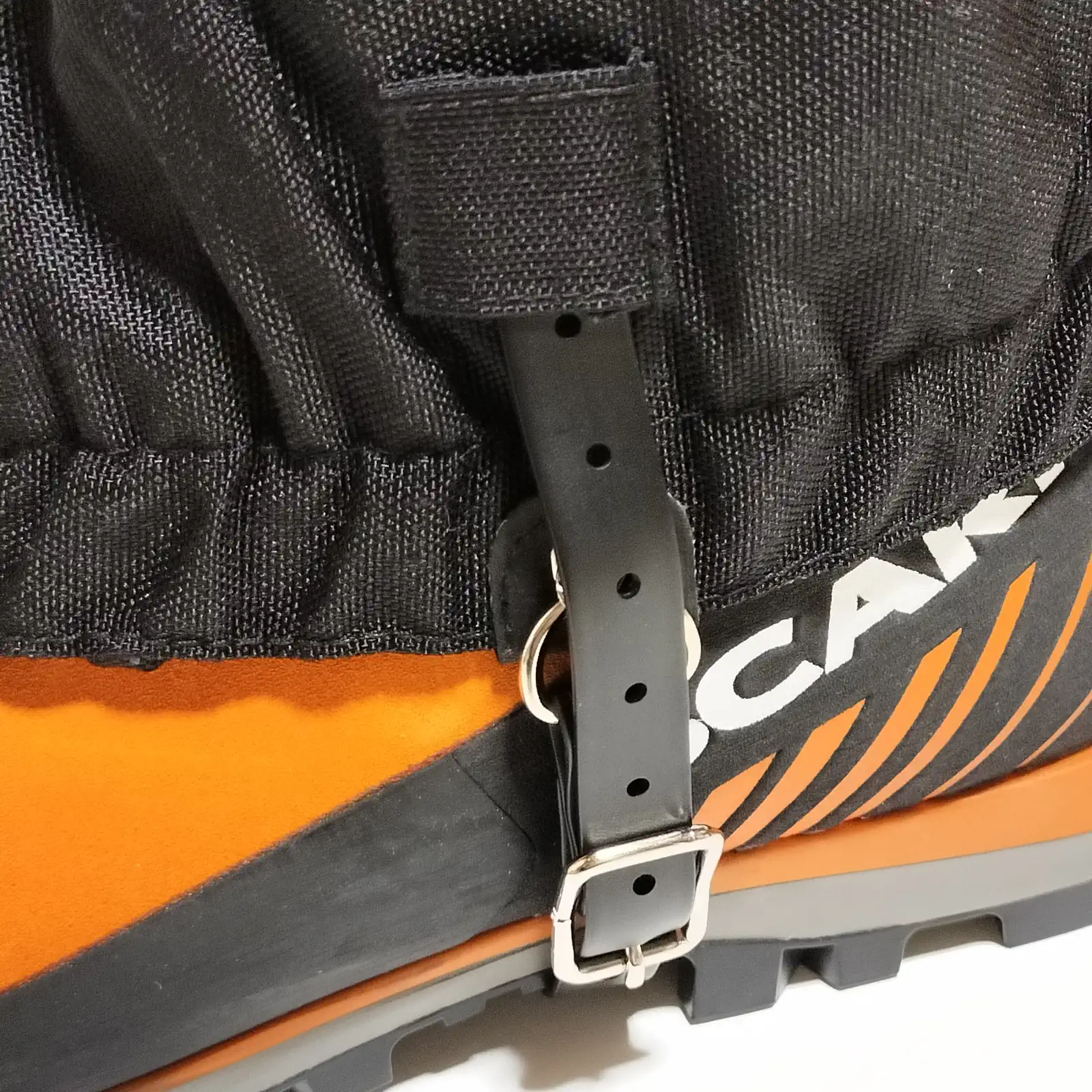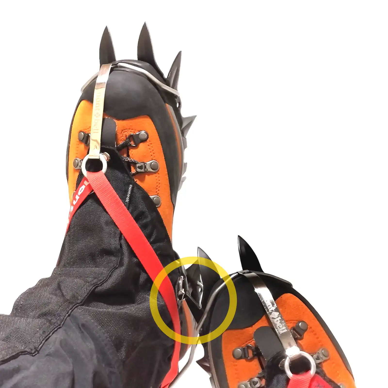特筆すべきは、靴底ストラップの調節機構をゲイターの内部に収めているところです。外観がすっきりし、氷雪や岩に引っかかりにくくなっています。