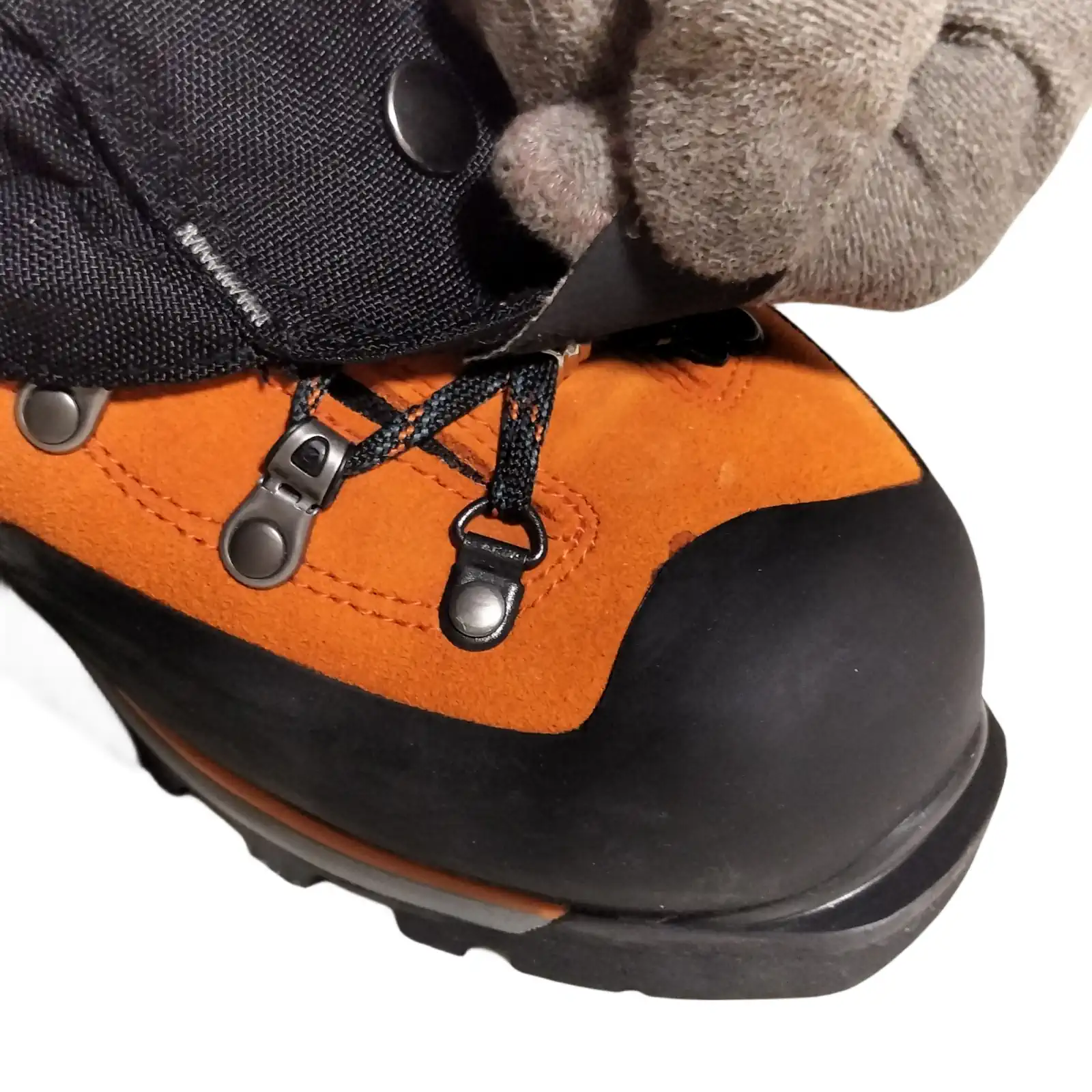 最大の特徴は、底バンドのストラップ(ワイヤー製!)を甲の上で留めること。ゲイター着脱の最難関を独自の発想と設計で解決しました。