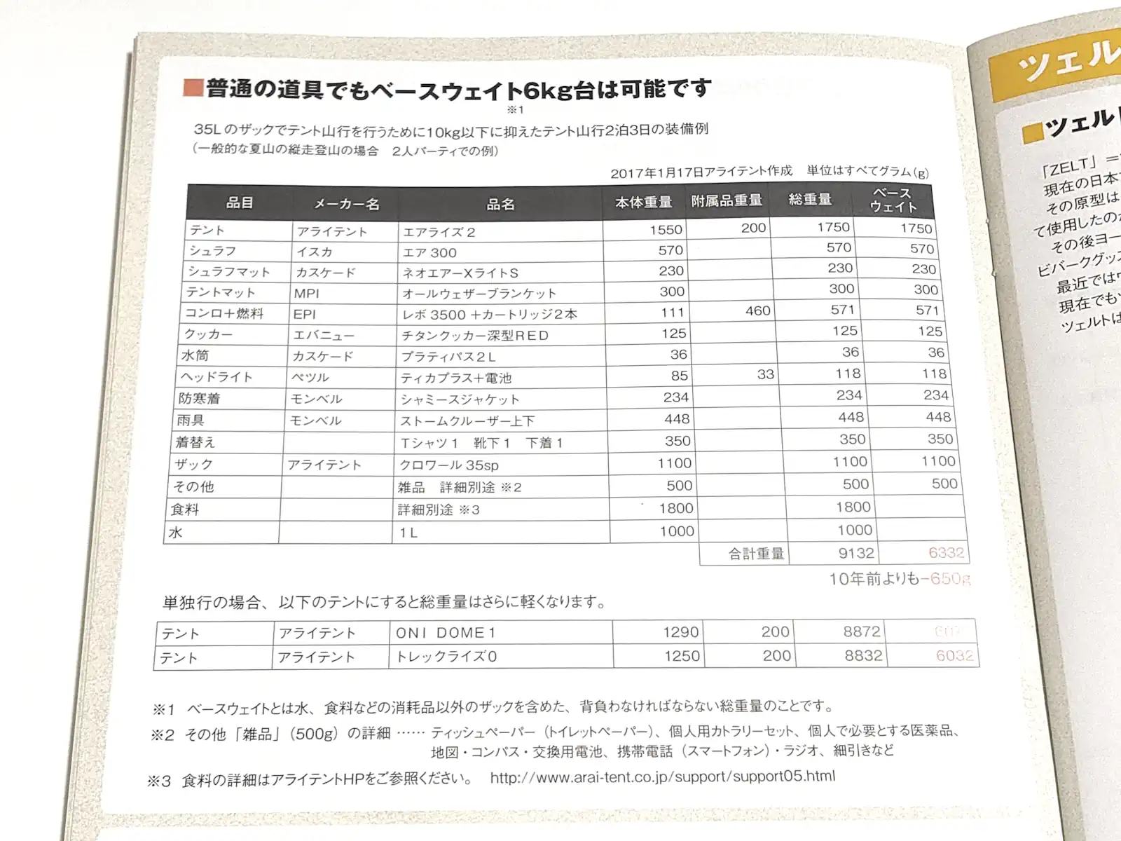 『軽量装備の夏山テント山行のススメ』と題されたページには「普通の道具でもベースウェイト6kg台は可能です」という力強い標題が掲げられています。他メーカーの製品まで引き合いに出して、具体的な装備と重量をリスト化しています。