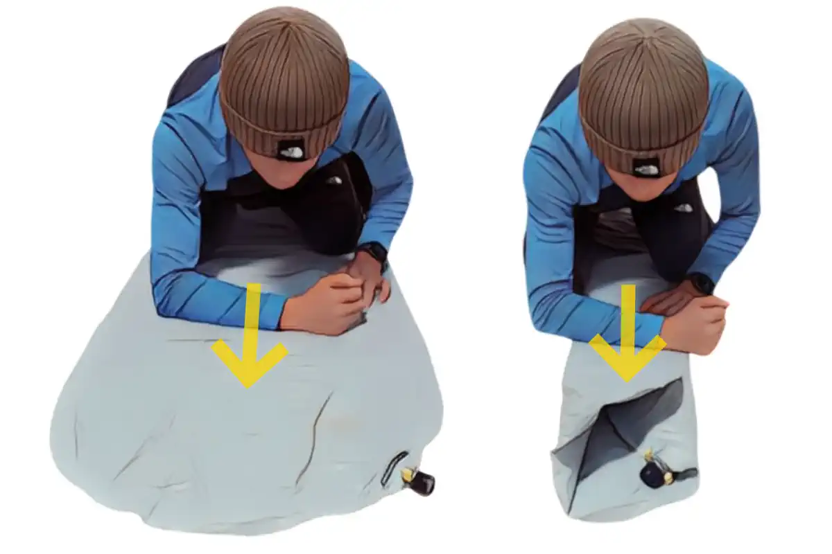 - 三つ折りにして、再度、前腕でしごくように空気を押し出す。