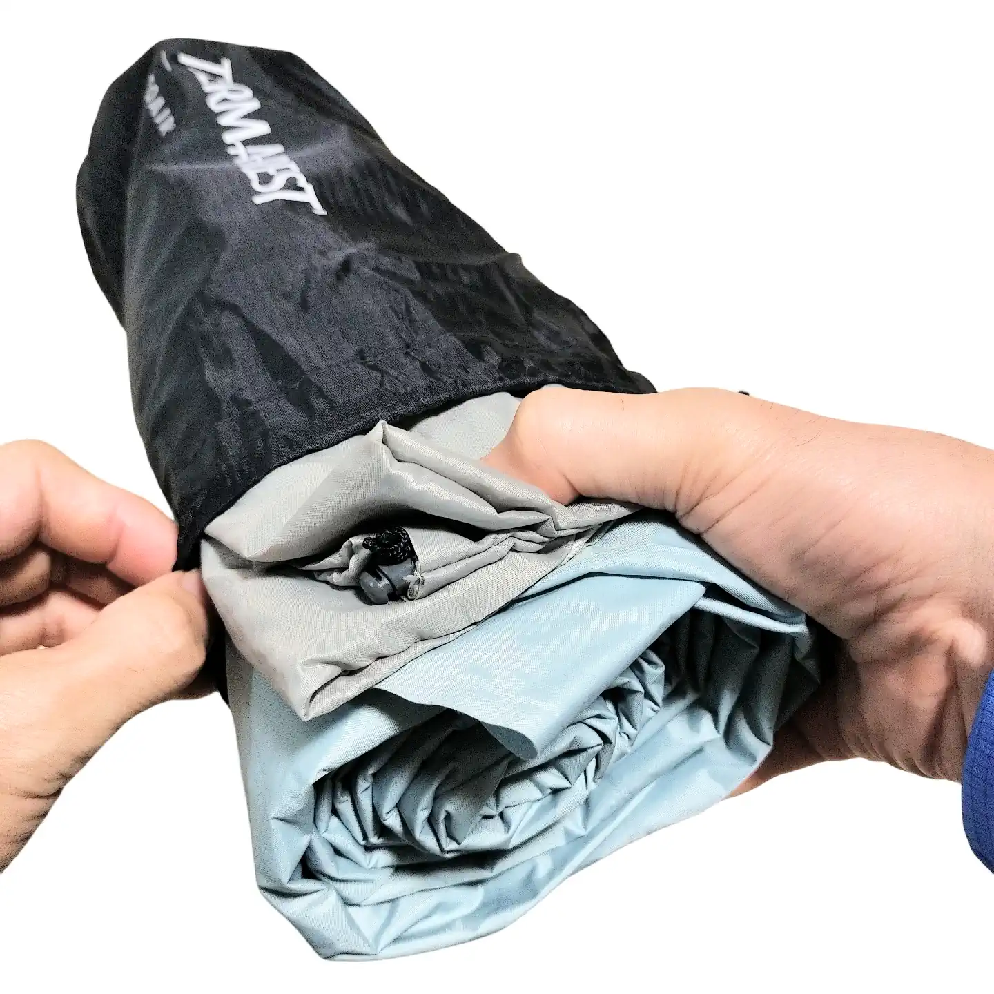 紺色のスタッフサックはサイズにゆとりがあり、丸めたマットレスとポンプサックを容易に収納できます。