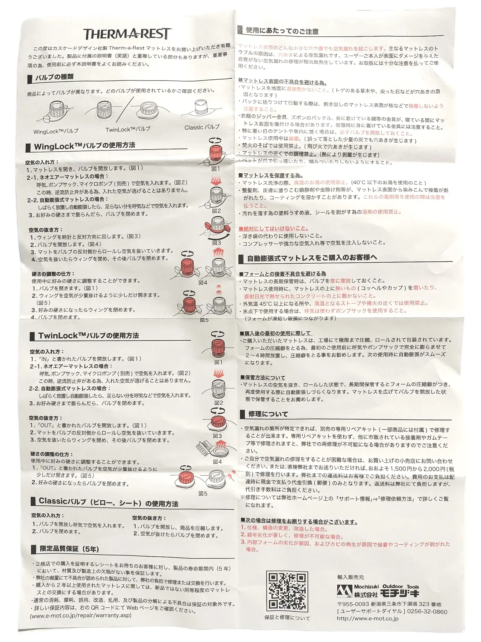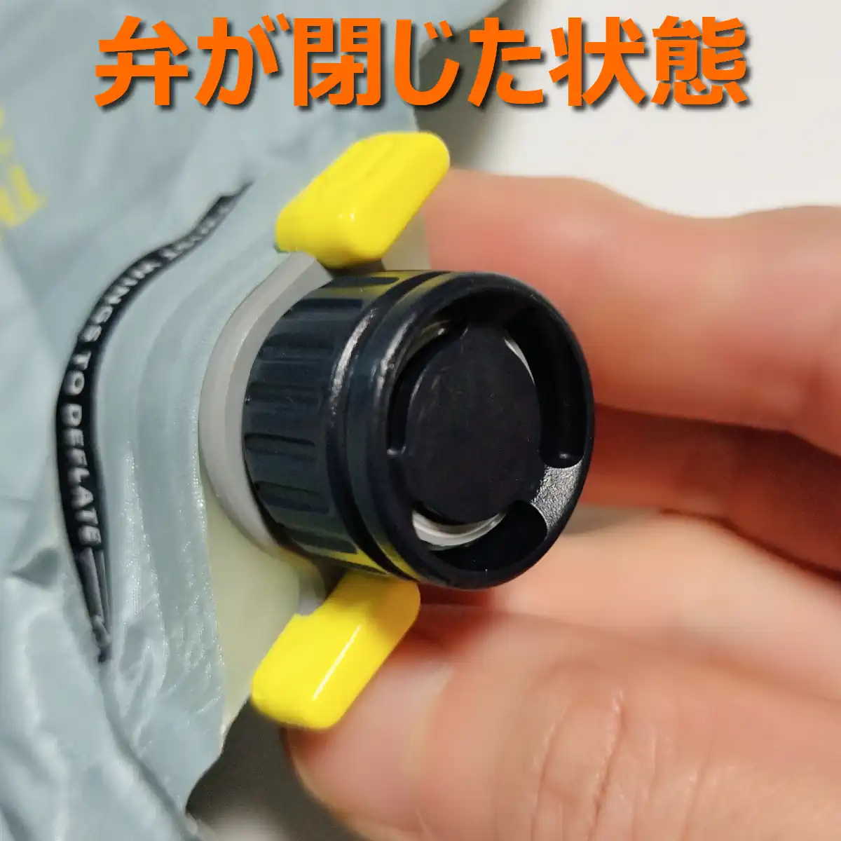 「ネオエアー XサーモNXT」本体のバルブには注意書きがぶら下がっています。