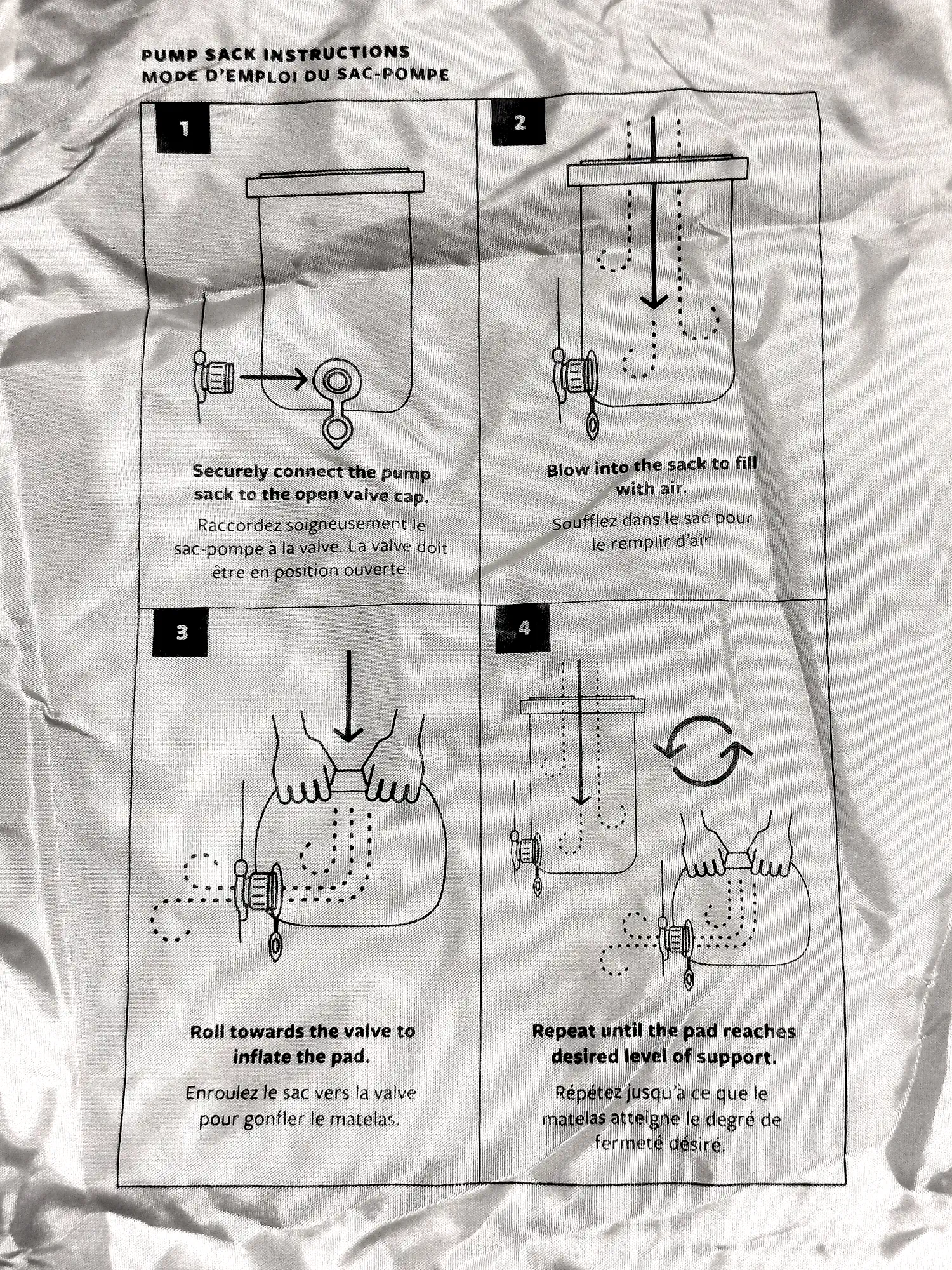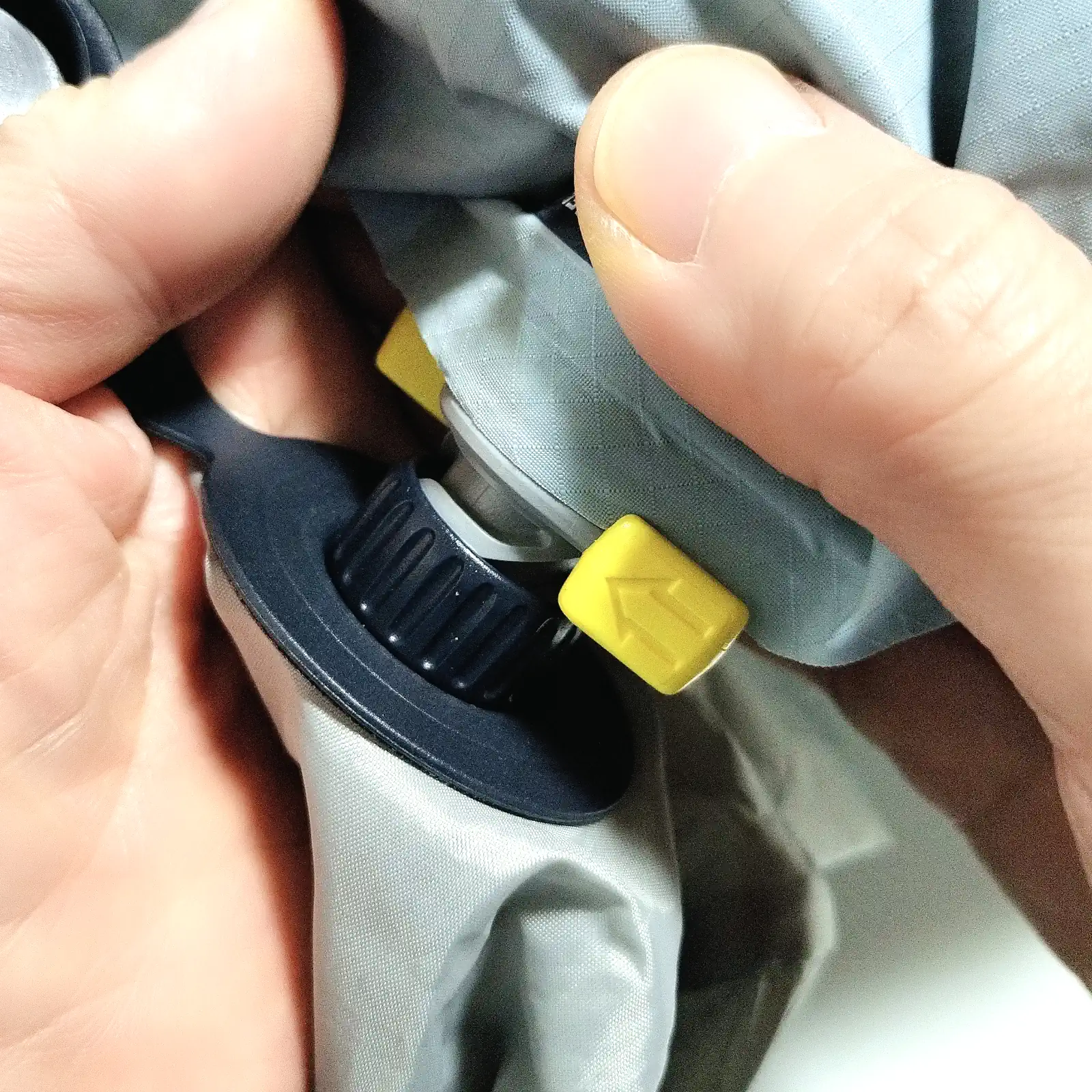 ひとつ気になるのは、マットレスに埋め込まれたウイングロックバルブの土台が角張っていること。ポンプサックと連結するとき、裏側から強く押すと、生地に鋭角の負荷がかかりがちです。手のひらで真後ろから押し込むことをおすすめします。