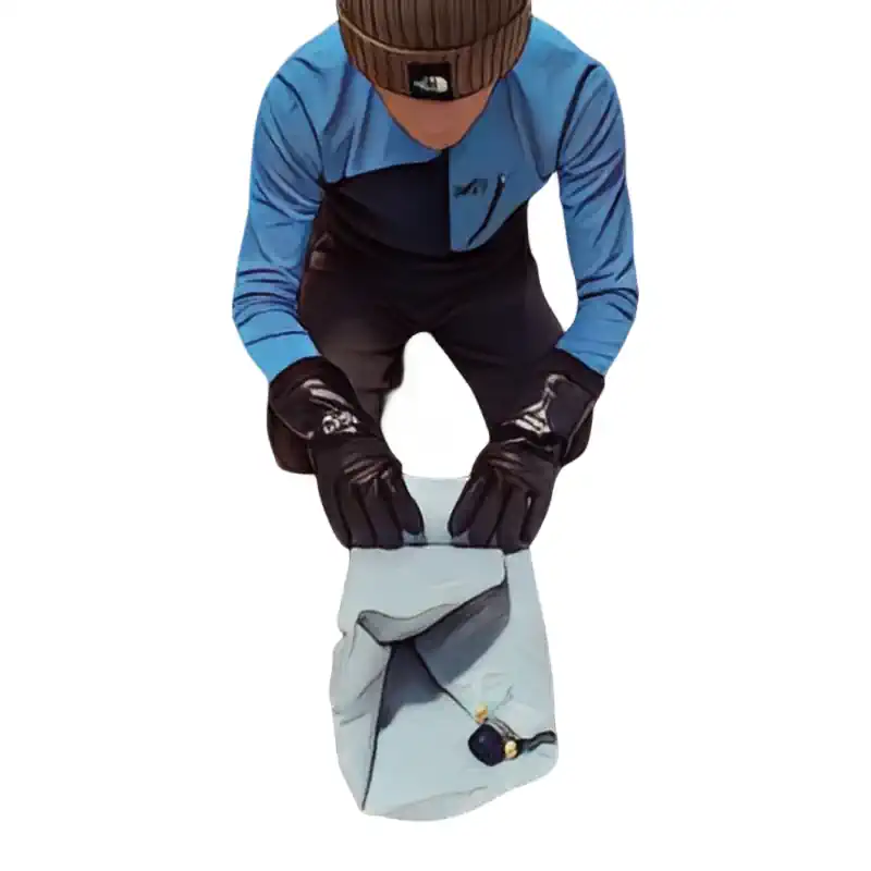 - 足側から頭側に向けて、小さく丸める。雪山テント泊の撤収時はマットレスがきんきんに冷え、霜にまみれているので、手にテムレスを嵌めるとよい。