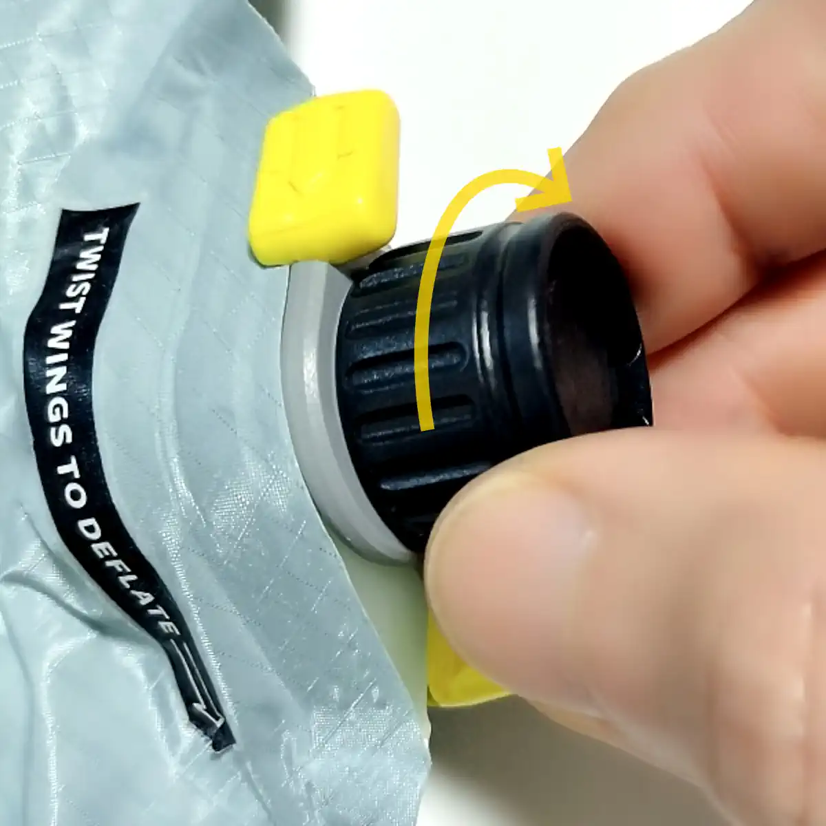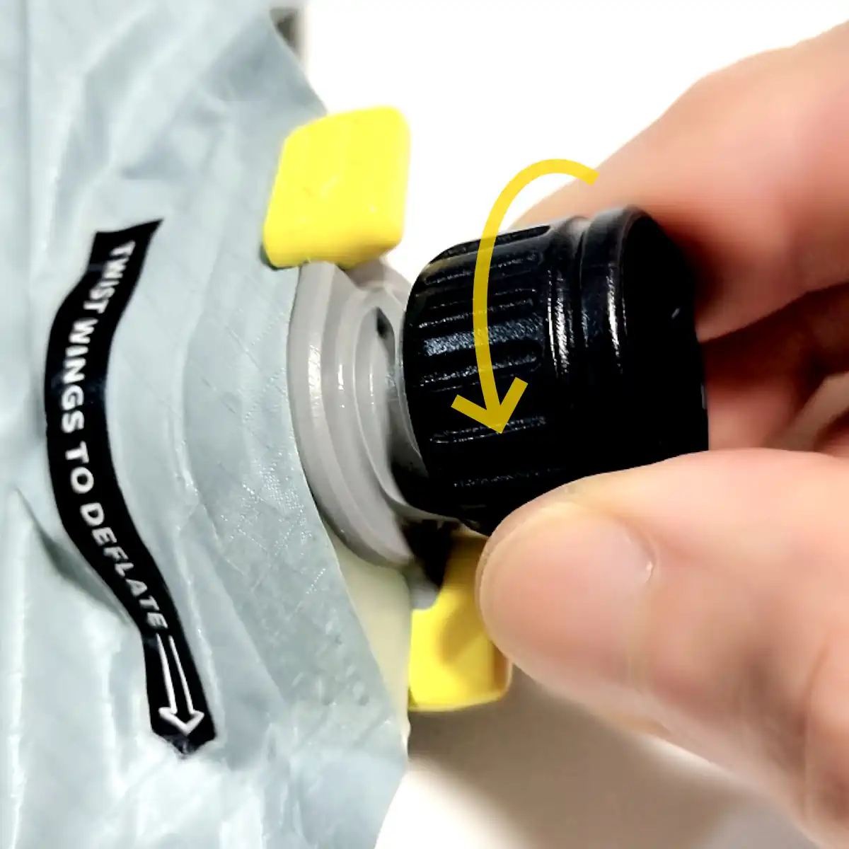 マットレスが十分に膨らんだら、バルブを時計回りにまわして閉じます。ウイングロックを閉じていれば空気が逆流しないので、慌てふためいて閉じる必要はありません。